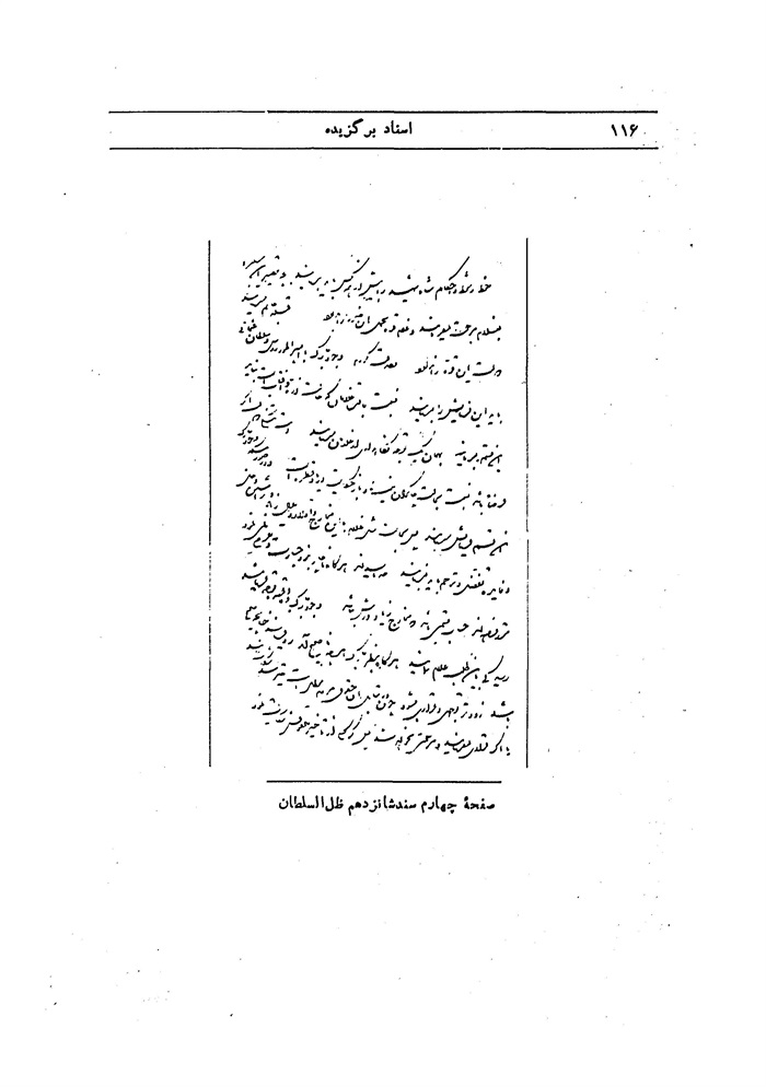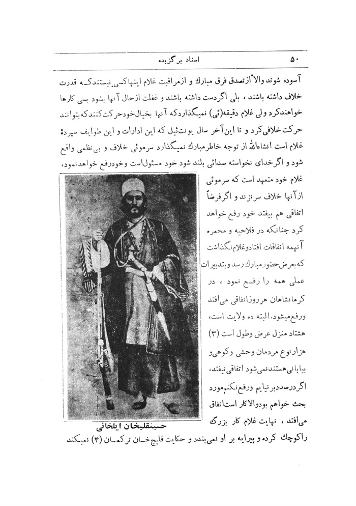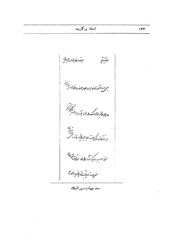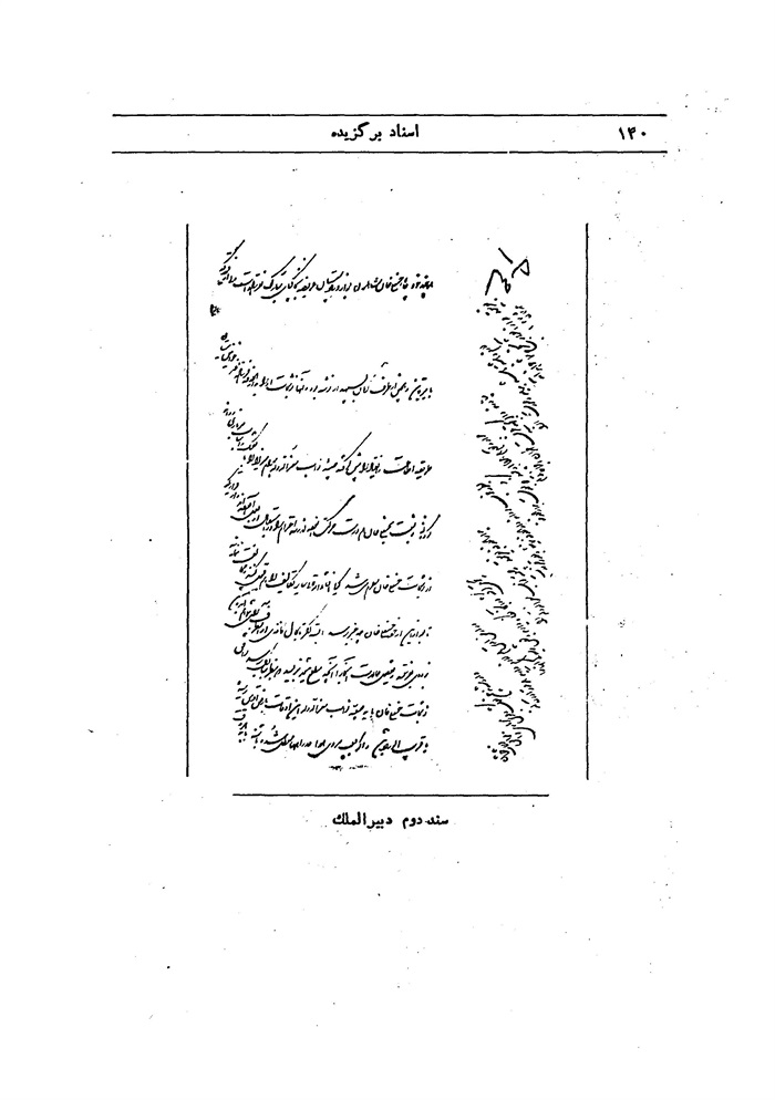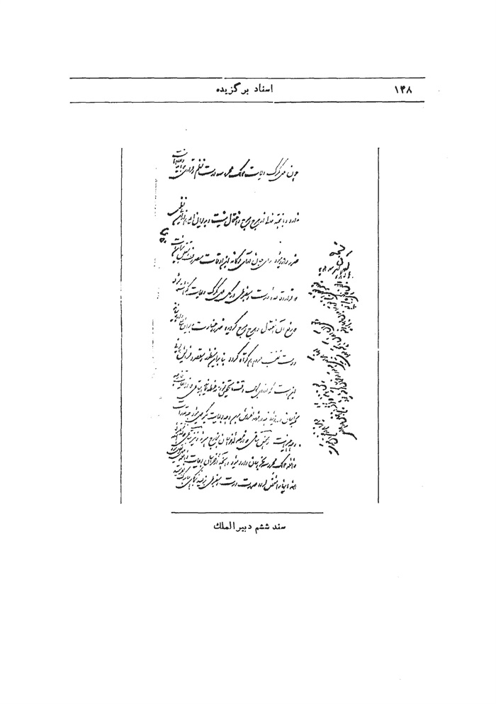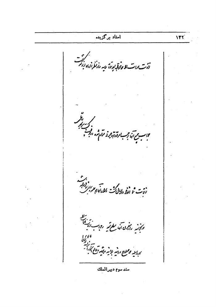اينك هم هفتمین کتاب اسناد سیاسی را بنام «اسناد برگزیده »حاوی نامه های مهم و جالب از سپهسالار- ظل السلطان -دبیر الملك -تقدیم پیشگاه تاریخ و تاریخ نگاران می دارم و باز هم در این راه از پای نخواهم نشست و امیدوار به ادامه ی این خدمت هستم . (1)
