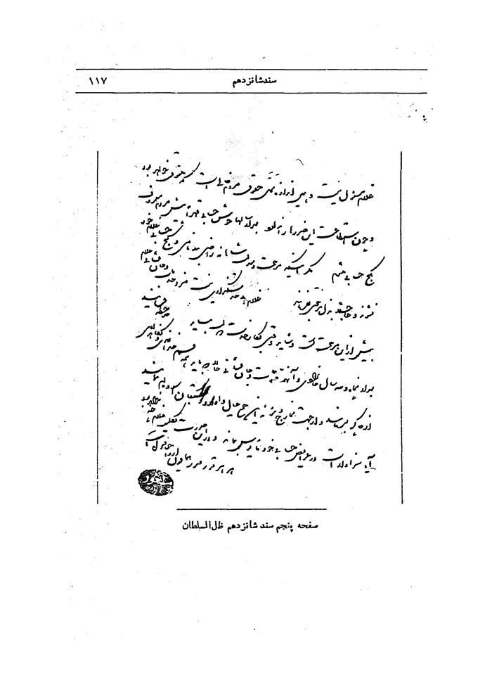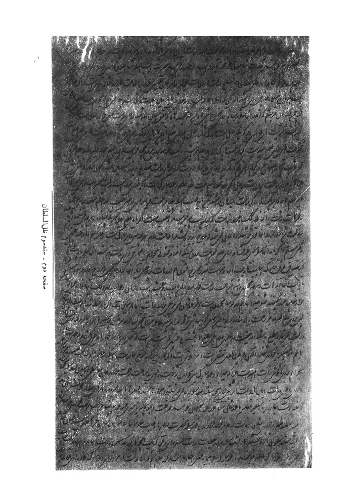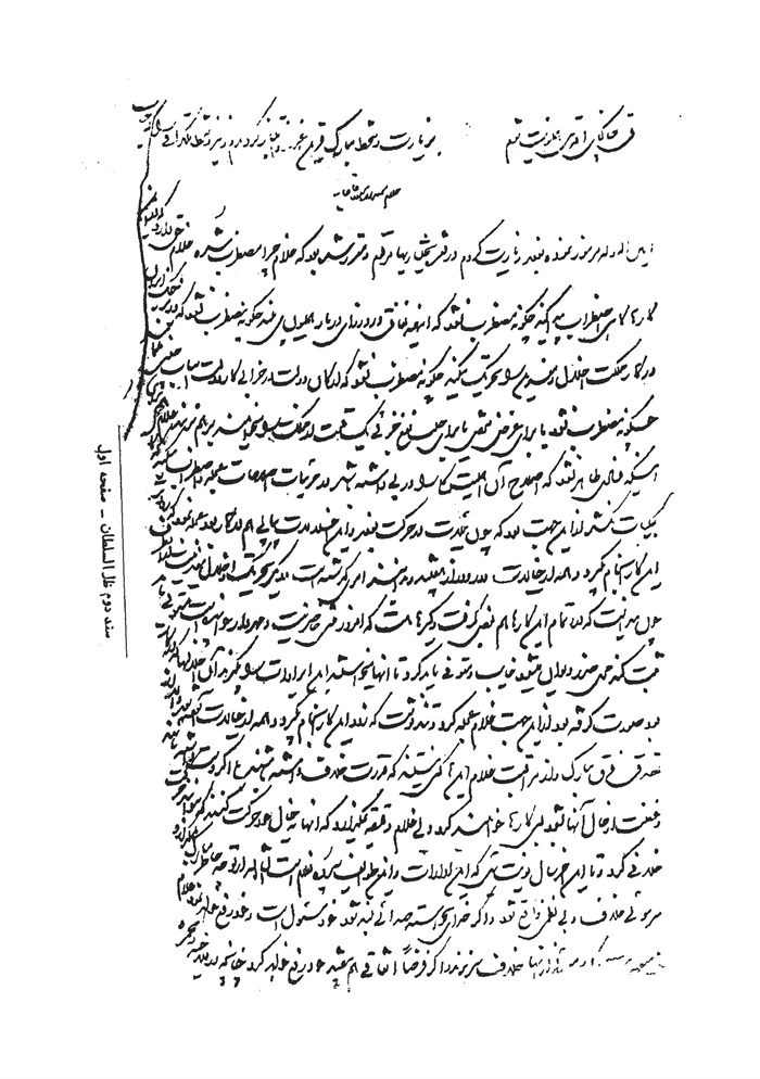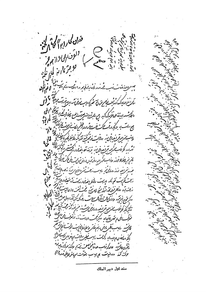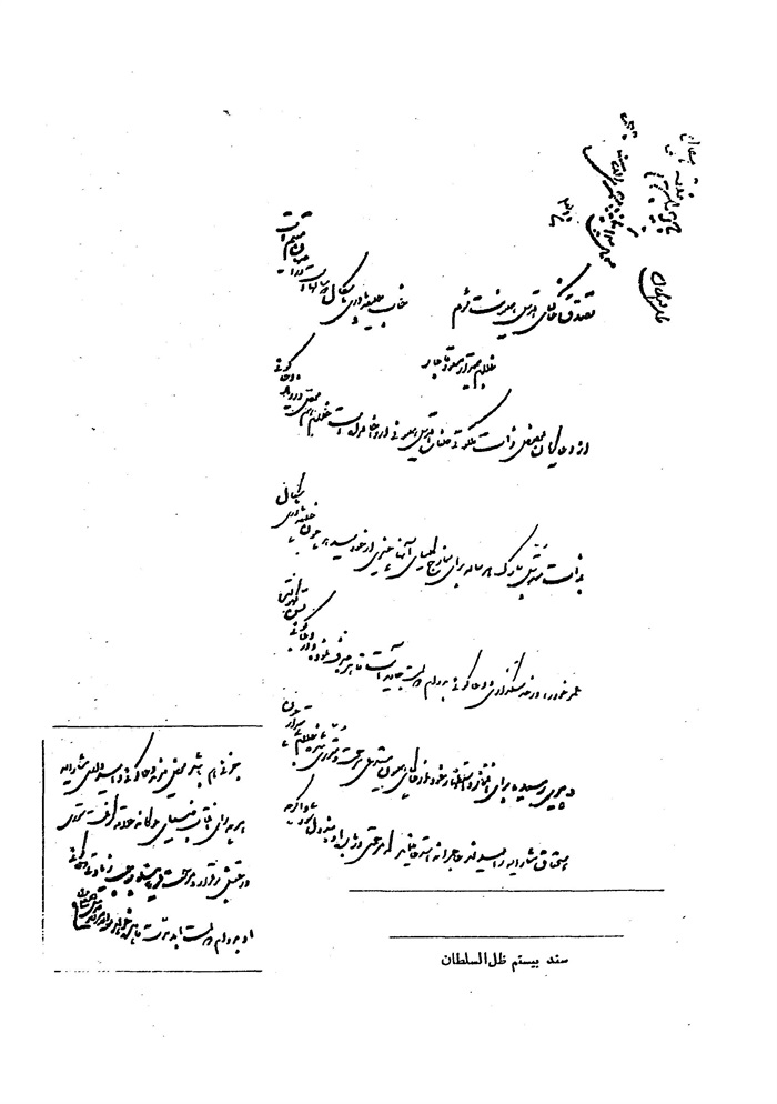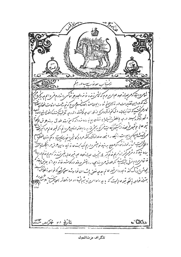 قربان خاکپای جواهر آسای اقدس همایونت شوم - علامت خريطه ی منحوسه که در عثمانی طبع شده بنحوی بود که ذات اقدس همایونی روحنا فداه مقرر فرموده بودید ،اگر چه این گونه نقشه ها بهیچ وجه طرف اعتنا نمی تواند شد معذلك محض اطاعت امر همایونی فردا هم صورت تقریری که باید در روزنامه طبع بشود و هم سواد کاغذی که بسفارت عثمانی باید فرستاده شود هر دو را حاضر کرده بحضور مبارك مي فرستد ،چون امشب را به طوری که به خاک پای همایون عرضه داشت در منزل جناب علاء الدوله (1) با شاهزاد گان مهمان بود و بعضی مذاکرات می نمود نتوانست این چند فقره را حاضر نماید تا فردا انشاء الله تعالی حاضر شده از عرض حضور مبارك خواهد گذشت.