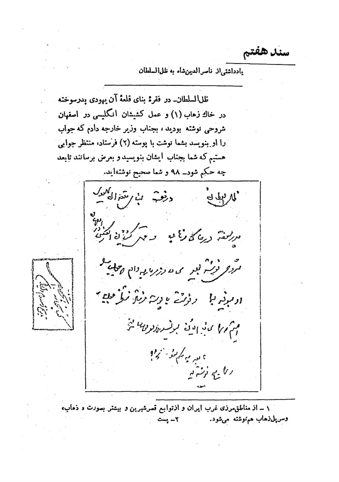 فرمایشاتی که پریروز در دست خط مبارك شرف صدور یافته بود که از قول خود بمشارالیه گفته اطمینان بدهد ،جميعاً را گفتم و کاغذ وزير مختار انگلیس را هم که مقرر فرموده بودند بمشارالیه نشان بدهم اطاعت کردم و جواب را هم ارائه نمودم ،از جواب خیلی ممنون و خوشحال شد و مجلس بمودت و خصوصیت زیاد ختم گردید ، مراتب بجهة استحضار خاطر خطیر انور همایونی روحنا فداه عرض شد .