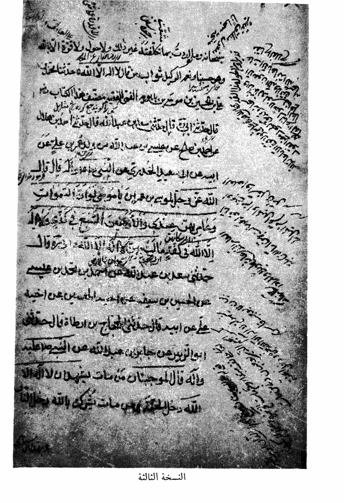 حَدَّثَنَا مُحَمَّدُ بْنُ عَلِيِّ بْنِ اَلْحُسَيْنِ بْنِ مُوسَى بْنِ بَابَوَيْهِ اَلْقُمِّيُّ اَلْفَقِيهُ مُصَنِّفُ هَذَا اَلْكِتَابِ رَضِيَ اَللَّهُ عَنْهُ قَالَ حَدَّثَنِي أَبِي ره قَالَ حَدَّثَنِي سَعْدُ بْنُ عَبْدِ اَللَّهِ قَالَ حَدَّثَنِي أَحْمَدُ بْنُ هِلاَلٍ عَنْ أَحْمَدَ بْنِ صَالِحٍ عَنْ عِيسَى بْنِ عَبْدِ اَللَّهِ مِنْ وُلْدِ عُمَرَ بْنِ عَلِيٍّ عَنْ أَبِيهِ عَنْ أَبِي سَعِيدٍ اَلْخُدْرِيِّ عَنِ اَلنَّبِيِّ صَلَّى اَللَّهُ عَلَيْهِ وَ آلِهِ قَالَ قَالَ اَللَّهُ جَلَّ جَلاَلُهُ لِمُوسَى بْنِ عِمْرَانَ : يَا مُوسَى لَوْ أَنَّ اَلسَّمَوَاتِ وَ عَامِرِيهِنَّ عِنْدِي وَ اَلْأَرَضِينَ اَلسَّبْعَ فِي كِفَّةٍ وَ لاَ إِلَهَ إِلاَّ اَللَّهُ فِي كِفَّةٍ مَالَتْ بِهِنَّ لاَ إِلَهَ إِلاَّ اَللَّهُ .(1)