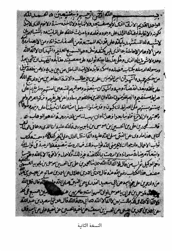 2 - نسخة مخطوطة وهي مع كمال الدين في مجلد ، لمكتبة الاستاذ «المحدث» أيضاً . تقع في 196 صفحة ، بقطع 25 × 20 سم و 22. سطراً . كاتبها محمد تقى الشيرازي ابن نظام الدین محمود الأنصاري" . تاريخها سنة ست وخمسين بعد الألف .