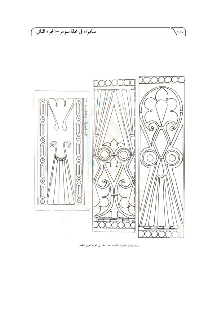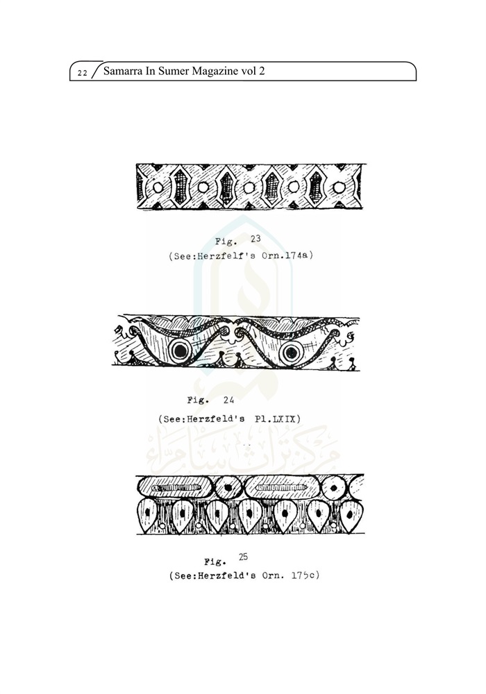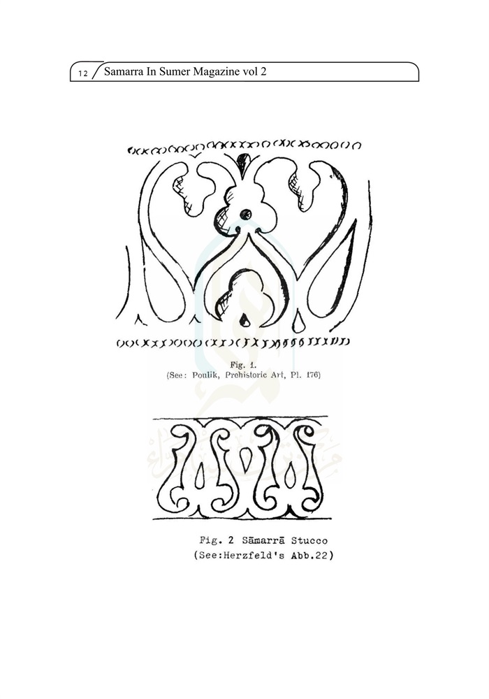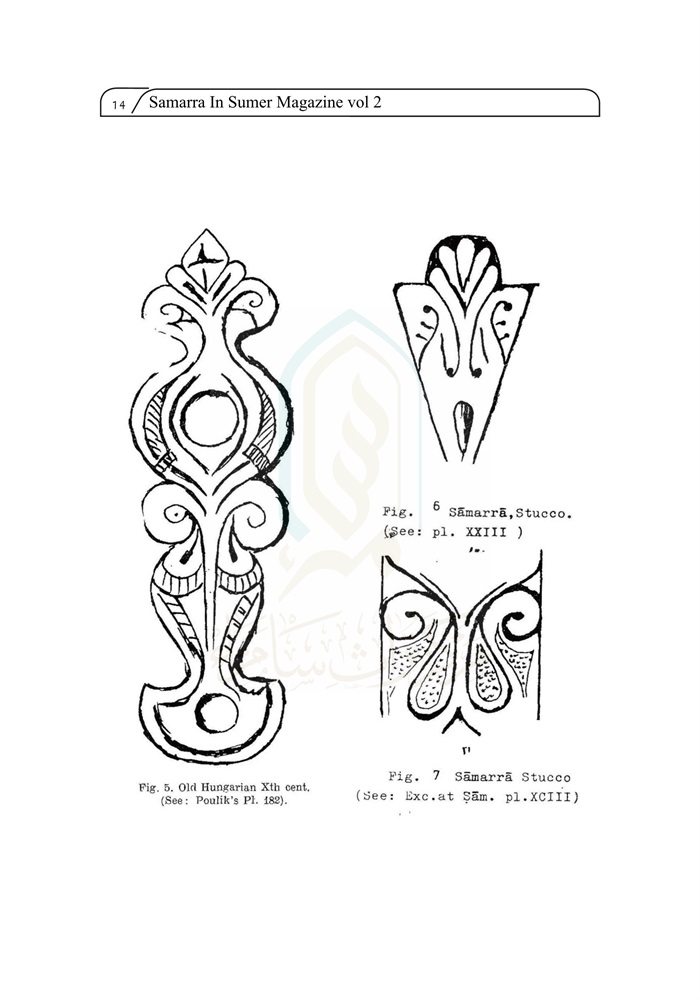 An ornamented iron backet. for example, recovered from a Slav burial attributed to the second half of the ninth century A D, which showing an Openwork design of combined scroll and palmettes (Fig. 1) is very similar in design to some motifs appear in samarra is style C. (such as the one illostrated in Fig. 2) (4) also a nomadic bronze object attributed to the 7th century A.D. (slav Cluture) (5), shows a scroll (Fig 3) almost identical