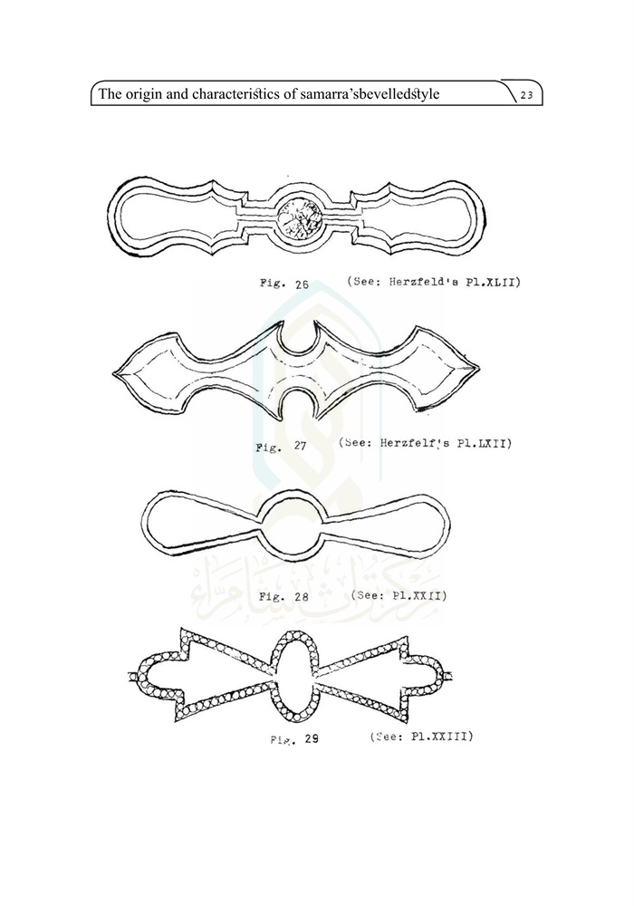 There is no evidence that the hevelled technique appeared on objects other than metals prior to the samarra era. Thus, it is possible that the appearance of the technique in samarra was actually a direct immitation of metal work, particulary when one notices that many odd devices which superimpose style C motifs are very strange to the actual stucco patterns. Thes devices which are either drop-shaped, circular or elliptical in shape recall instantly precious stones inlaid in personal ornaments. They appear not only in stucco (Figs. 20, 21, 22), but also in samarra's wood decoration. (Figs. 23, 24, 25).immitation of personal jewelry in stucco can also be supported by the fact that the shape of style C repeated units (Figs. 26, 27, 28, 29) are similar to braclets; such as braclets brought to light in Hungarian nomad burials of 5th -9th centuries A.D. (Figs. 30, 31, 32, 33).
