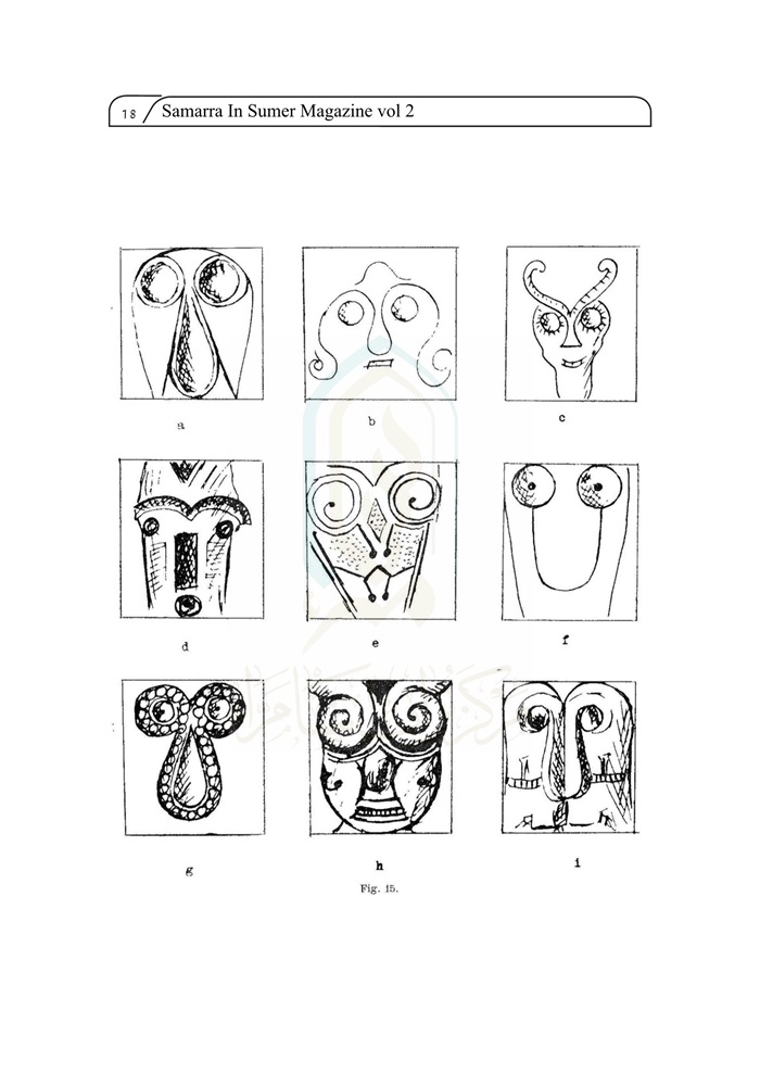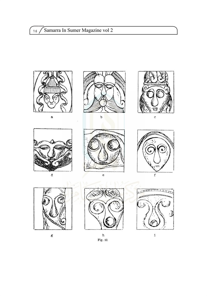 The "hmnan face" also occurs very frequently among the ornaments of the xomads. It seems to be derived originully from Celtic Art, Where it appears in naturalistic Form (Fig. 12a, 12b). or in stylized fashion (Figs. 12c,12f. 12g, 12i) (1). The motif is also represented in scrolls (Fig. 13) and in hands (Fig. 14) (2). In the 5th-7th centuies A.D. of the nomadic period the motif is mainly represnted in stylized Fashion (Figs. 15a, b.c. d. e. f. g. h. i). The "human face" motif. Which never occurs in sassanian, pre-Islamic Syrian, or umayyad art, not only unmistakably appears in a very similar fashion to its representation in Nomad