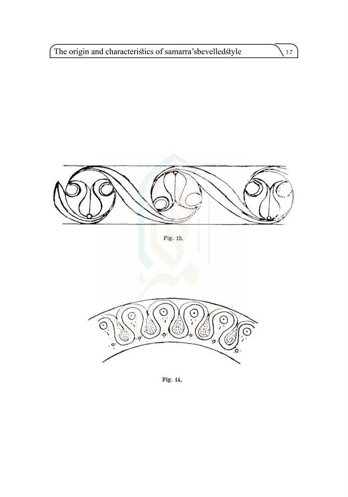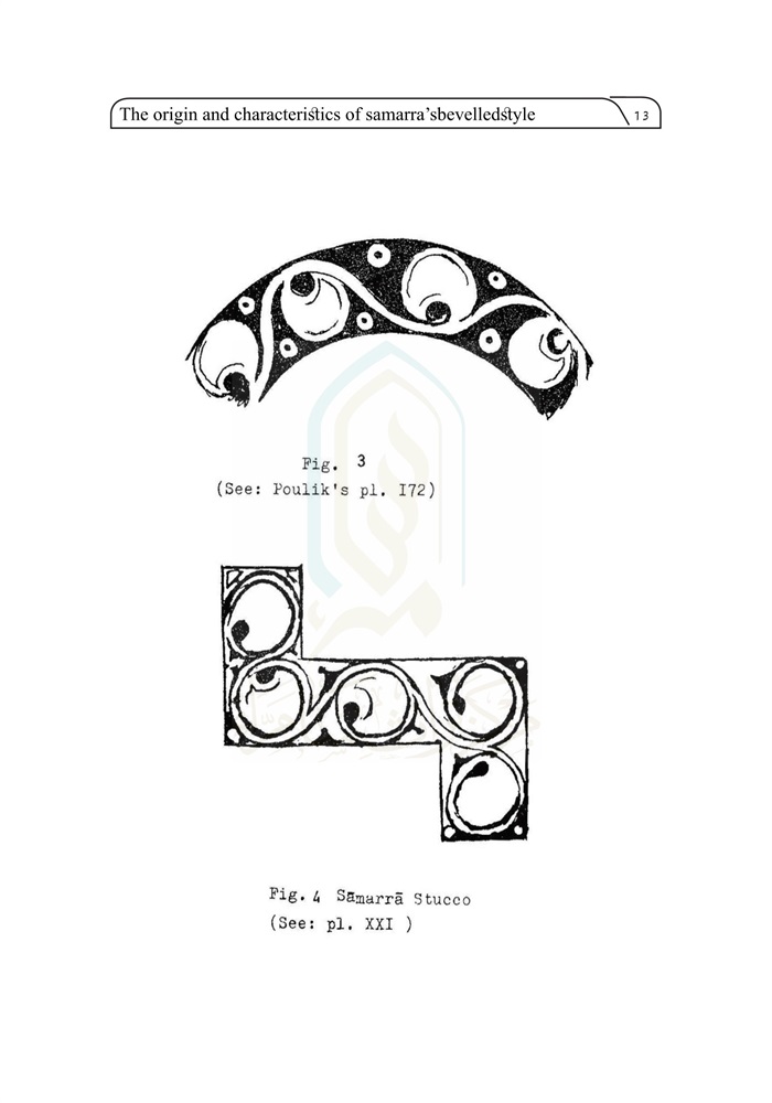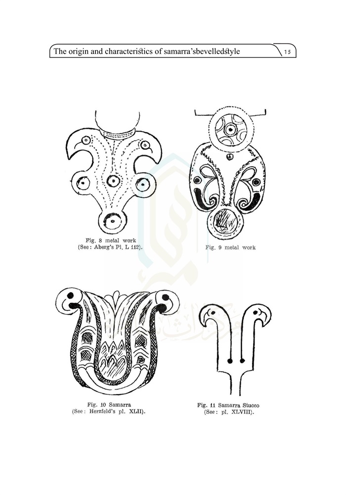 In Celtic Art, the technique reached a very high degree of perfection. in which most versions of the scrolls, the palmette and its variations, are executed(2). In spite of the Celt's disappearance in a period well before the Christian era, the style had lasted long after, particularly in places the Romans could not dominate such as Ireland. Scotland and Germany(3). Moreover, the many excavations carried out in Central Asia and Eastern and Central Europe during the last thirty Years or so. Brought to light many objects ascribed to the 6th-9th centuries A.D. showing not only the same bevelled technique but also patterns almost similar to those of samarra's 9th A.D. century.