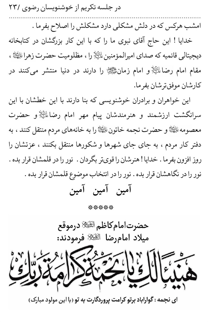 به آقایان خطاط توصیه می کنم که این صلوات امام عسکری(علیه السلام)بر امام رضا(علیه السلام)را جزء آثاری که امسال خلق می کنند قرار دهند و بدان اهتمام ورزند. یا همه صلوات را و یا همین دو سطر اوّلش را بنویسند .