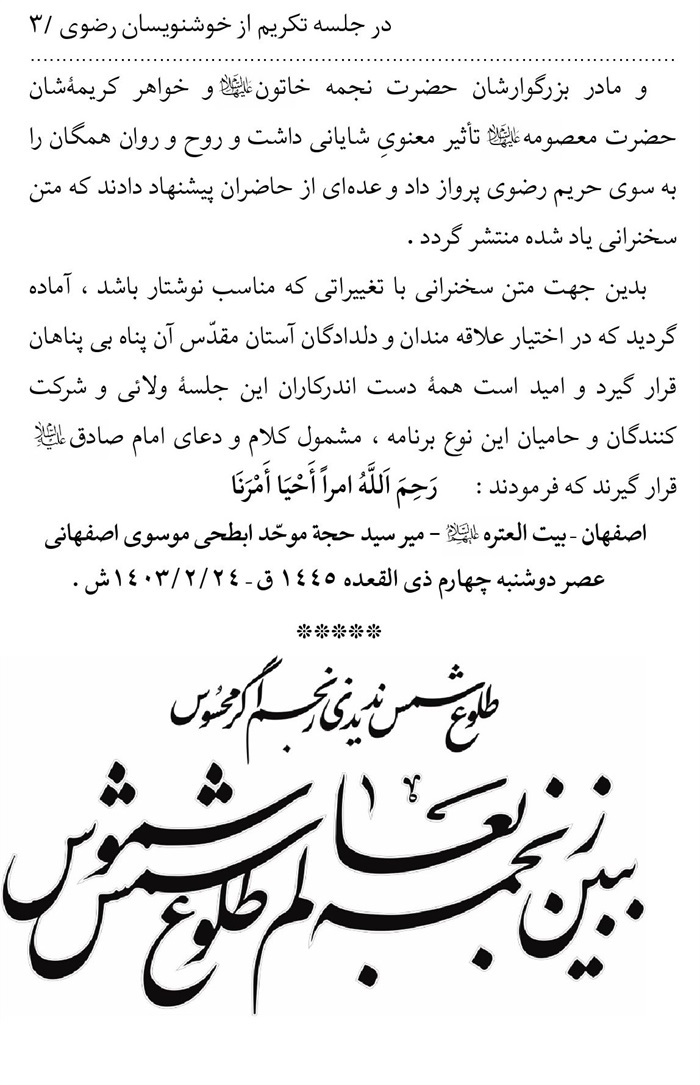 در یک صحنۀ اتفاقی و در ارتباط با مادر امام رضا(علیه السلام)، حضرت نجمه خاتون(علیها السلام)خبردار شدم که یک گروه هفتاد نفره از اساتید خطّ و خوشنویسان اصفهان در ضمن یک گروه منسجم مقرر شده است که در ایام میلاد مقدّس امام علی بن موسی الرضا (علیهما السلام)به سوی حریم قدسیِ آن حضرت سفر کنند و در مدت اقامت در مشهد مقدّس ، طی برنامه ای نورانی به عرضۀ آثار خوشنویسی در مورد حضرت رضا(علیه السلام)و حضرت معصومه(علیها السلام)و مادر بزرگوارشان