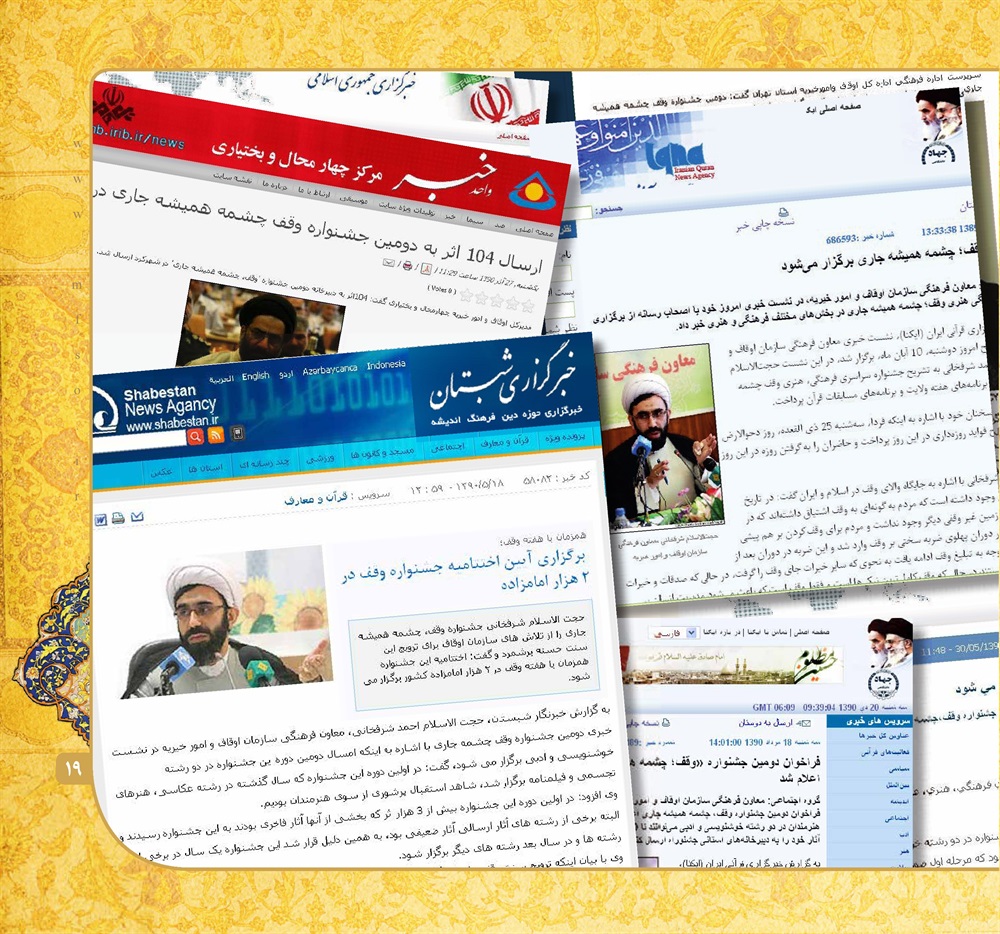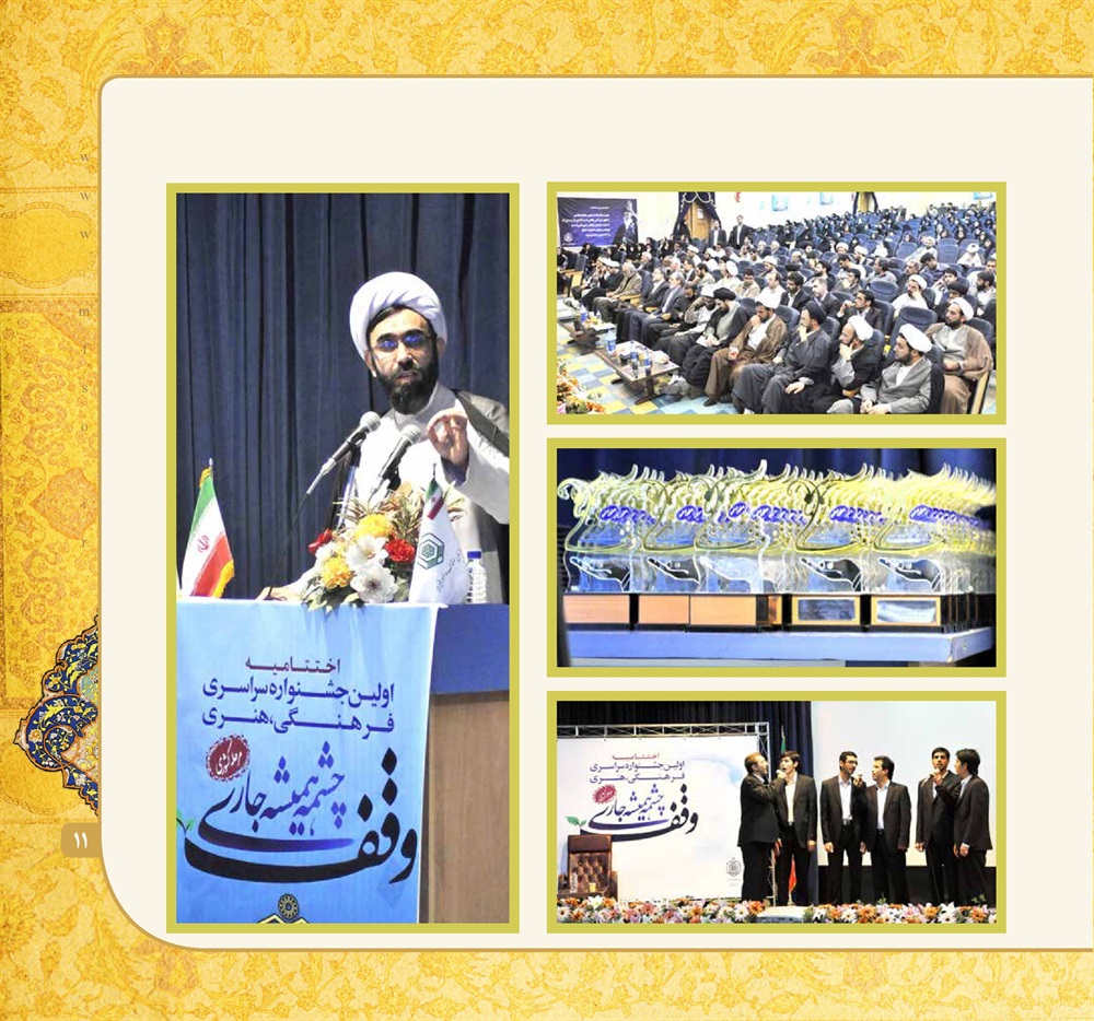 اولین جشنواره سراسری فرهنگی، هنری «وقف چشمه همیشه جاری» طی دستورالعمل ابلاغی در تاریخ 89/8/15 و درسه بخش 1- مسابقات فرهنگی و هنری 2- آموزش نشست ها و همایش ها 3- بخش نمایشگاهی به استان ها ارسال گردید