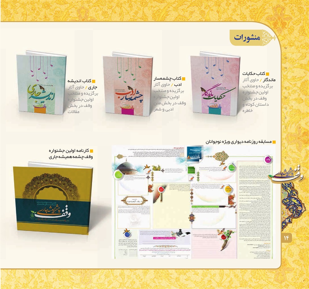در این راستا معاونت فرهنگی سازمان اوقاف و امور خیریه با برگزاری دومین جشنواره فرهنگی هنری وقف چشمه همیشه جاری اقدام به تبلیغ و ترویج فرهنگ وقف در قالب های هنری نمود که در بخش های گوناگون شاهد خلق آثار فاخر و گرانبهایی از هنرمندان خوش فکر و اندیشمند این مرز و بوم بودیم. از این رو برای ارج نهادن به هنرمندان گرامی و جهت ارائه آثار ایشان اقدام به تهیه و نشر کتاب حاضر نموده است.