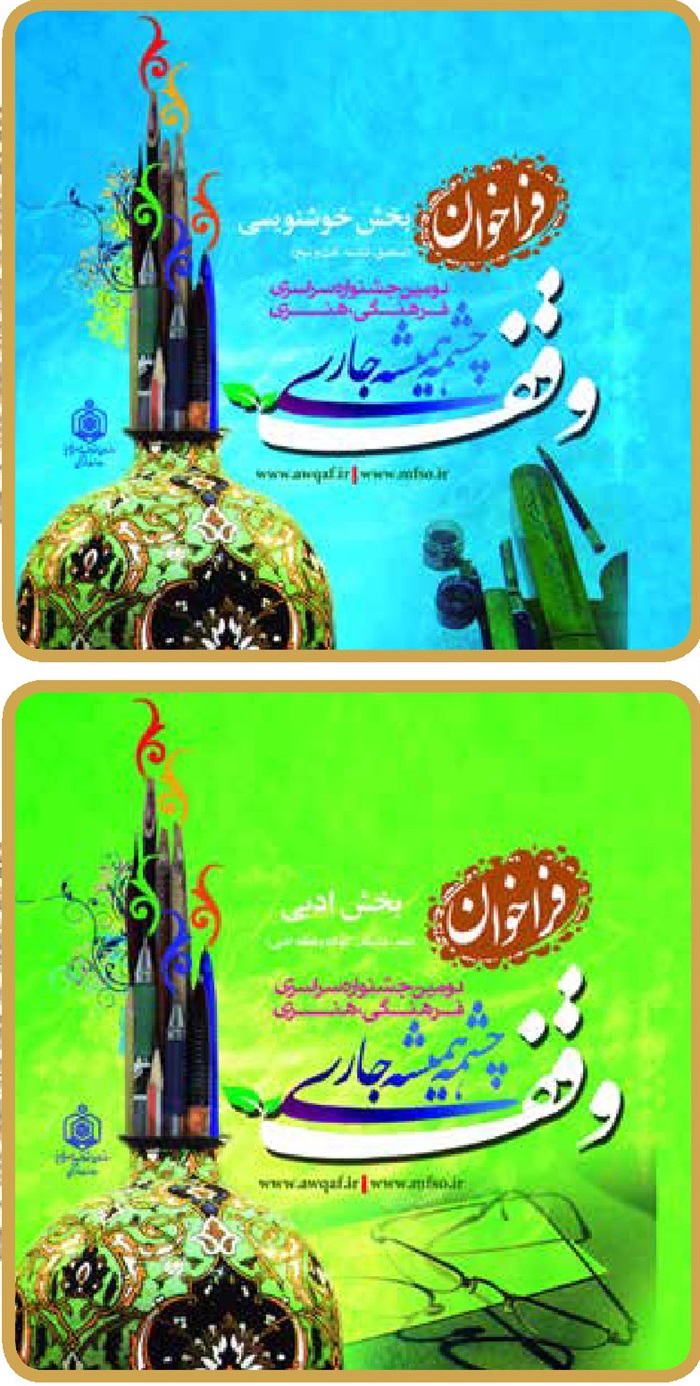 دبیرخانه دومین جشنواره فرهنگی هنری «وقف چشمه همیشه جاری» فراخوان جشنواره را در دو بخش خوشنویسی (نستعلیق، شکسته نسخ و ثلث) و ادبی (داستان) ،کوتاه شعر و قطعه (ادبی) در قالب دستورالعمل به تمامی استان ها ارسال و طبق زمان بندی اعلام شده مهلت آن به دبیرخانه استانی تا پایان آذرماه سال 90 اعلام گردید که با استقبال کم نظیر علاقه مندان مجموعا 2984 اثر به دبیرخانه های استانی ارسال گردید. بر اساس آمار ارائه شده از استان ها استان بوشهر با 412 اثر خوزستان 313 اثر و کردستان 273 اثر بیشترین آثار و استان های کهگیلویه و بویراحمد با 12 اثر البرز و یزد با 20 اثر کمترین آثار ارسالی را به خود اختصاص دادند.