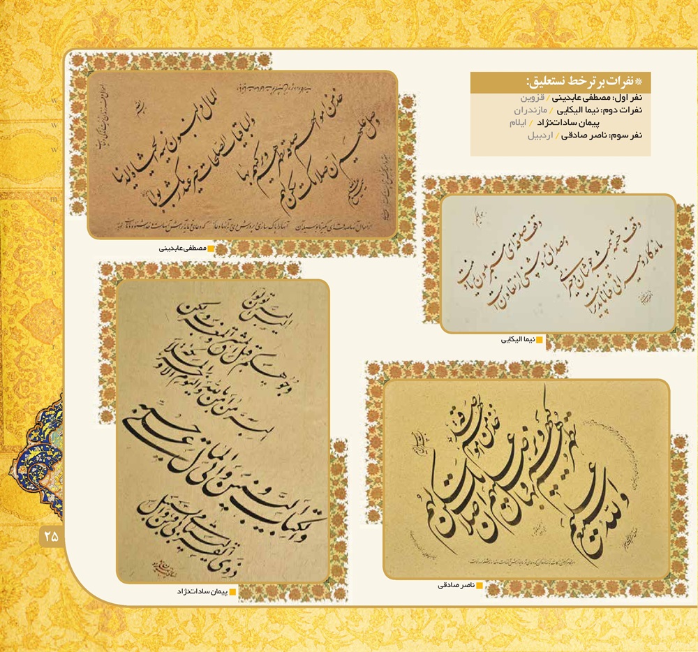 خط نستعليق: نفر اول، نیما الیکانی نفر دوم، سید مرتضی جعفری نفر سوم، سید پیام غضنفری