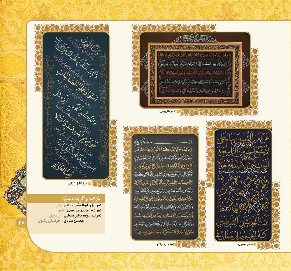 خط نسخ: نفر اول، حمیدرضا جندقی نفر دوم، ابوالفضل ارشیاء، نفر سوم، حامد خاکی