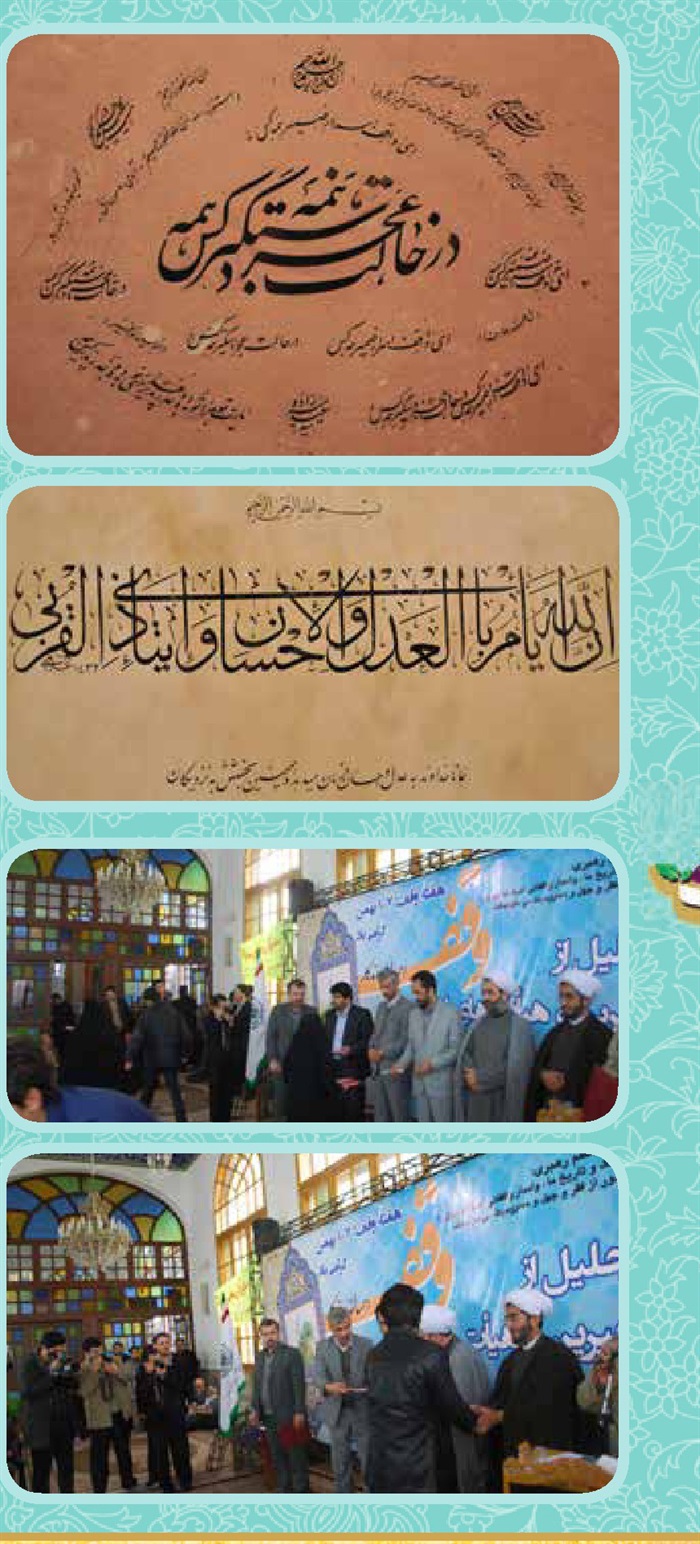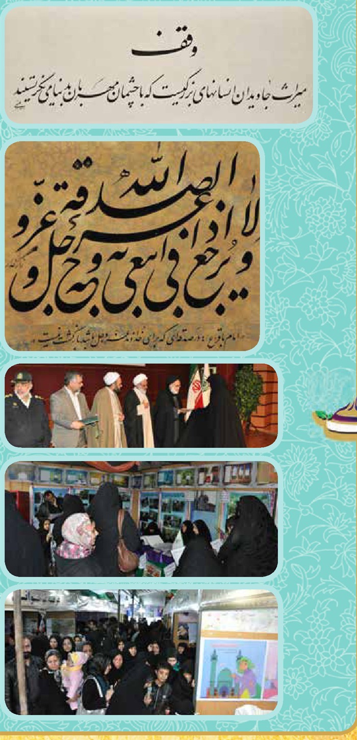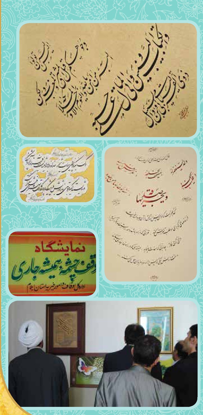 نمایشگاه : نمایشگاه فرهنگی هنری دومین جشنواره وقف چشمه همیشه جاری همزمان با هفته وقف در امامزادگان و بقاع متبرکه و مراکزی که از طرف اداره کل استان بدین منظور در نظر گرفته شده بود با محتوای آثار ارائه شده به بخش مسابقه ی جشنواره، گزارش عملکرد اداره کل استان و همچنین تابلوهای خوشنویسی اولین جشنواره وقف که به صورت بسته های نمایشگاهی از طرف معاونت فرهنگی سازمان ارسال گردید برگزار شد.