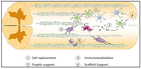 از سلول های بنیادی مقادیر قابل توجهی لامینین و فیبر و نکتین تولید می کنند، که هر دو جزء فاکتور های پیش برنده ی بقای سلول عصبی به شمار می روند و در بهبود ضایعه می توانند موثر واقع شوند.