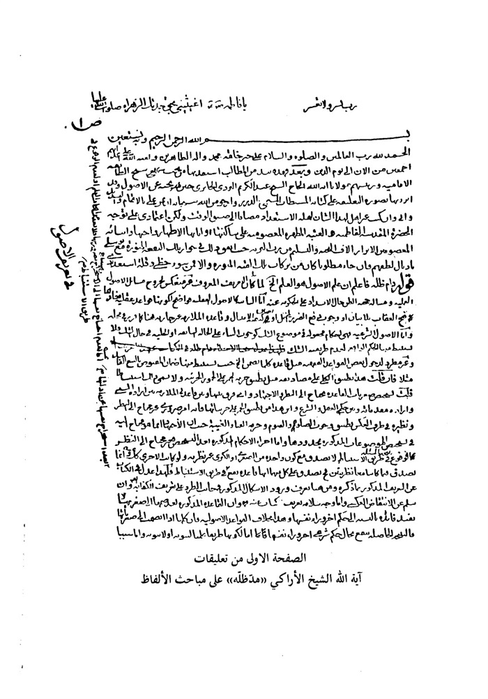 الصفحة الأولى من تعليقات آية اللّه الشيخ الأراكي (مدّ ظلّه) على مباحث الألفاظ