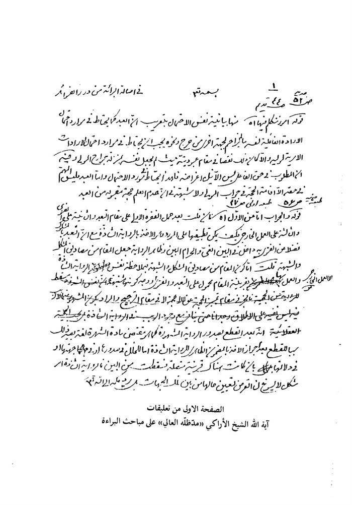 الصفحة الأولى من تعليقات آية اللّه الشيخ الأراكي " مدّ ظلّه العالي " على مباحث البراءة