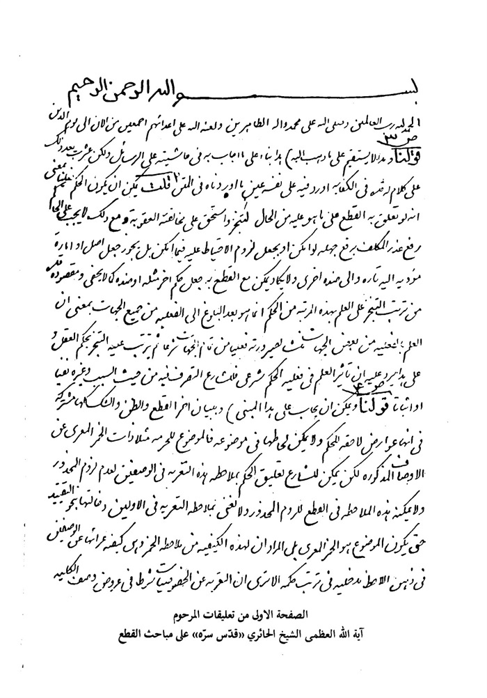 الصفحة الأولى من تعليقات المرحوم آية اللّه العظمى الشيخ الحائري (قدّس سِرُّه) على مباحث القطع