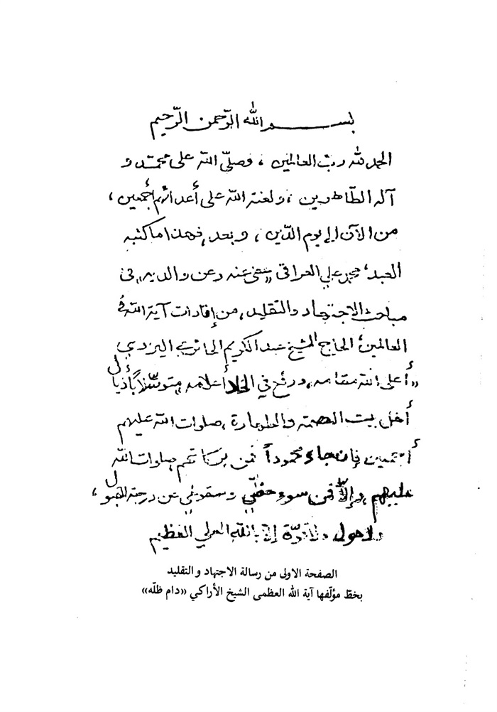 الصفحة الأولى من رسالة الاجتهاد والتقليد بخط مؤلفها آية اللّه العظمى الشيخ الأراكي (دام ظلّه)