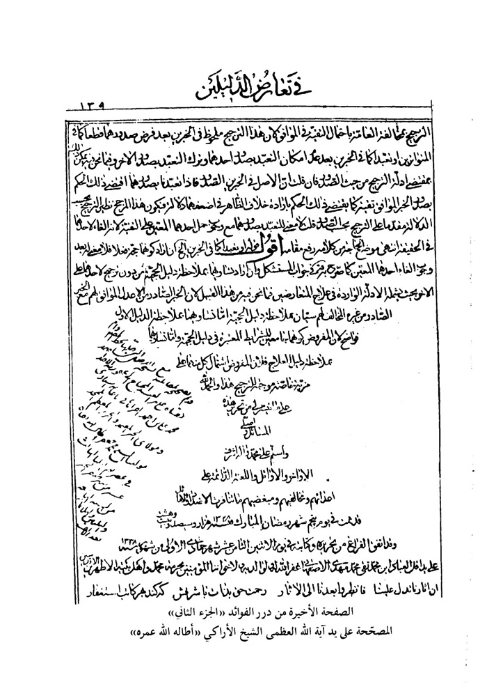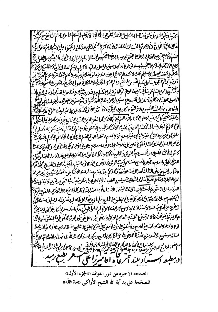الصفحة الأخيرة من درر الفوائد " الجزء الثاني " المصححة على يد آية اللّه العظمى الشيخ الأراكي " أطاله اللّه عمره "