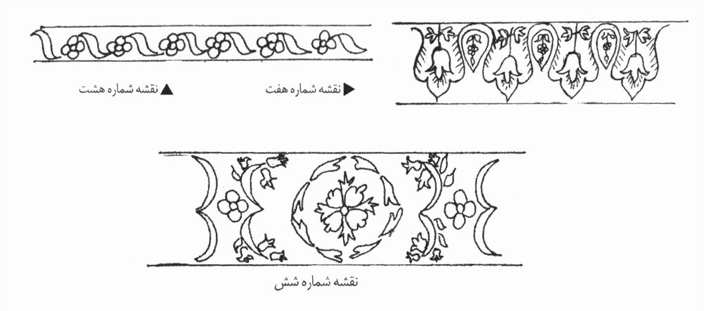 بین حاشیه ها خطوط 1 سانتی متری وجود دارد که نقش خاصی از گل و برگ دارد و فقط رنگ گل ها در خطوط فرق می کند. (نقشه شماره هشت)