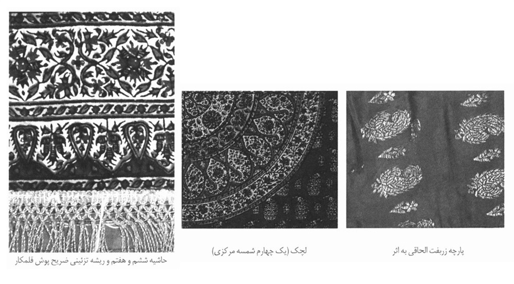 در مستطیل مرکزی بته زری های ظریفی زمینه را پر می کند و لچک ها به صورت (یک چهارم) شمسه میانی در چهار زاویه مستطیل دیده می شود .