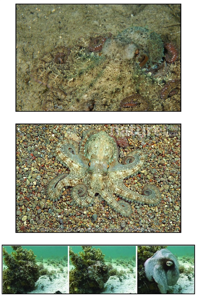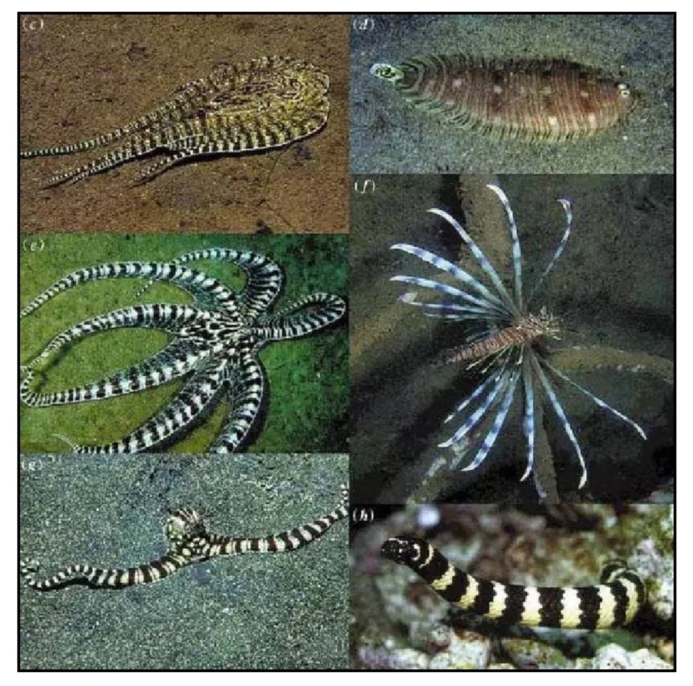 اختاپوس برای آنکه خود را شبیه به این مار کند، شش عدد از بازوهایش را درون حفره ای در داخل شنها قرار میدهد و دو بازوی دیگرش را بیرون نگه می دارد تا شکلی شبیه به مار پیدا کند.