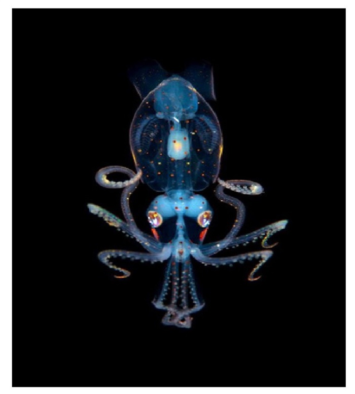 این نوع از ماهی مرکب، بدنی شیشه ای دارد، که با نقطه هایی پر از سلولهای دارای رنگ دانه پوشیده شده است، تمام قسمت های بدن این ماهی به جزتاج او کاملاً شفاف است به طوری که برای شکارچیان قابل تشخیص نیستند. فتوفور اندام مولد نور در این ماهی شکار را جذب می کند. این نقاط روشن حتی رنگ عوض می کنند و به استتار این جانور کمک می کنند. این نوع ماهی مرکب معمولاً در اقیانوس های گرمسیر و نیمه گرمسیر و در عمق 200 تا 1000متری یافت می شوند. در فارسی به این دلیل به آن ماهی مرکب می گویند.