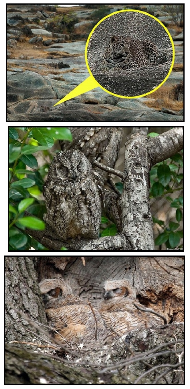 پرهای برخی از انواع جغدها نیز خط و خالی دارد، که با محیط زندگیشان بسیار منطبق است به گونه ای که به سختی می توان آن ها را تشخیص داد. در زیر عکس هایی از استتار این پرنده را خواهید دید.