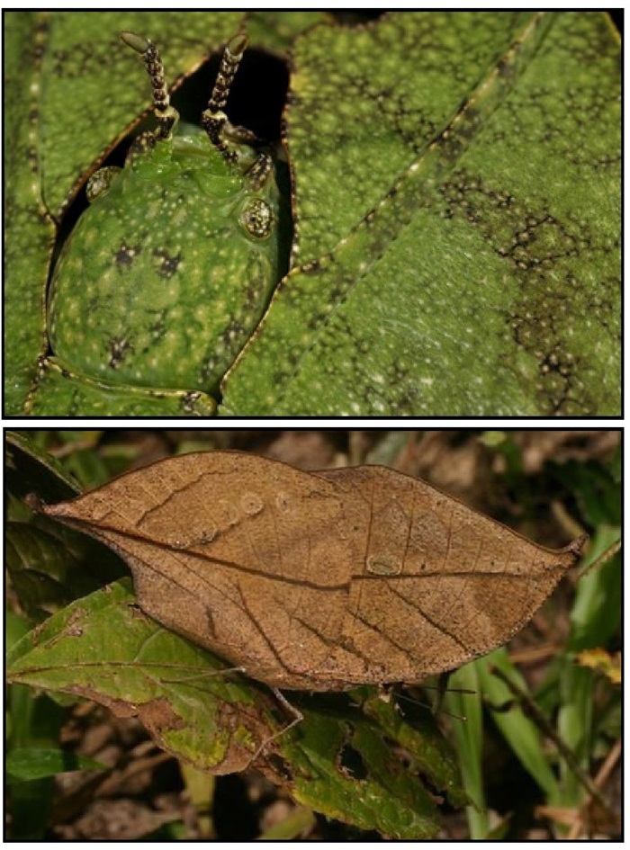 این حشره شبیه برگ رونده ای است، که نه تنها در هم آمیختن آن با رنگ و شکل محیط اطرافش کاملا بی عیب و نقص است؛ بلکه حتی هنگام وزش باد با تکان دادن بدنش به سمت عقب و جلو حالت برگ واقعی را تقلید می کند.