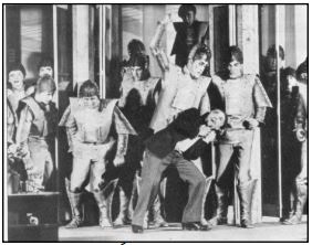 تصویری از نمایش RUR چاپک که ظاهراً ربات ها در حال شورش هستند.