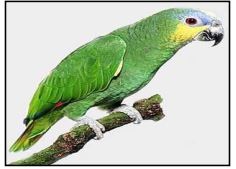 این پرنده نیز استعداد زیادی در صحبت کردن دارد. که از گونه طوطی های آمازون به حساب می آید. این طوطی در پشت گردن خود دارای زائده زرد رنگی است، که می تواند نشانه خوبی برای شناسایی آن باشد. این پرنده مثل سایر خانواده طوطی های سخنگو، صدای انسان را به خوبی تقلید می کند. این پرنده توانایی زیادی در کپی کردن صداهای اطراف خود دارد. طوطی آمازون زرد و نارنجی می تواند از سن جوانی صدای انسان را تقلید کند. مهم ترین عامل برای به سخن درآوردن آمازون زرد، تعامل بین صاحب طوطی با طوطی مورد نظر است. این پرنده نیز هم چنین می تواند، صدای آهنگی را که می شوند را تقلید کند.
