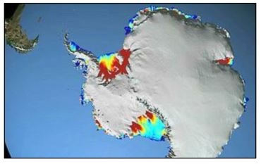 تحلیل رفتن: این نقشه کوه های عظیم یخی کرانه غربی قطب جنوب را درحال تحلیل رفتن و نازک شدن نشان می دهد. قسمتی که با رنگ قرمز مشخص شده معرف توده های یخی به ضخامت بیش از 550 متر، و قسمت آبی رنگ معرف