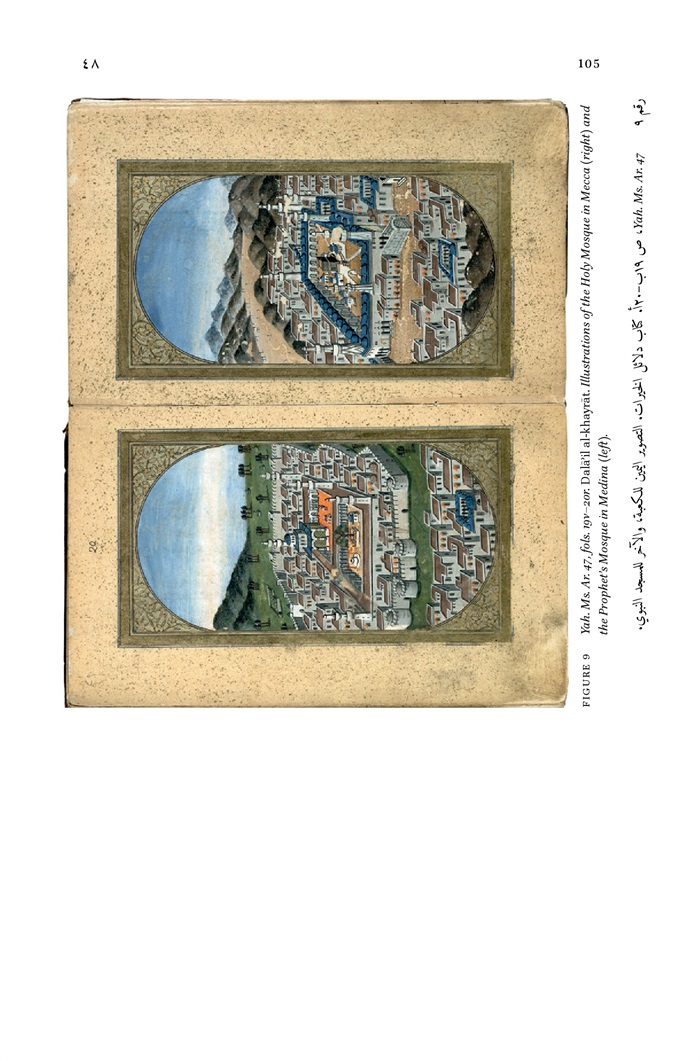 9 - Yah. Ms. Ar. 47, fols. 19v-20r. Dala'il al-khayrāt. Illustrations of the Holy Mosque in Mecca (right) and the Prophet's Mosque in Medina (left) 105