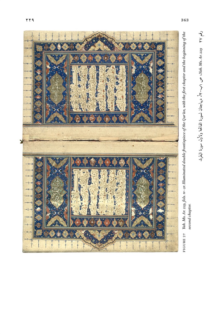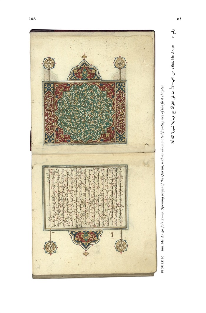10 - Yah. Ms. Ar. 50, fols. 2v-3r. Opening pages of the Qur'an, with an illuminated frontispiece of the first chapter 108