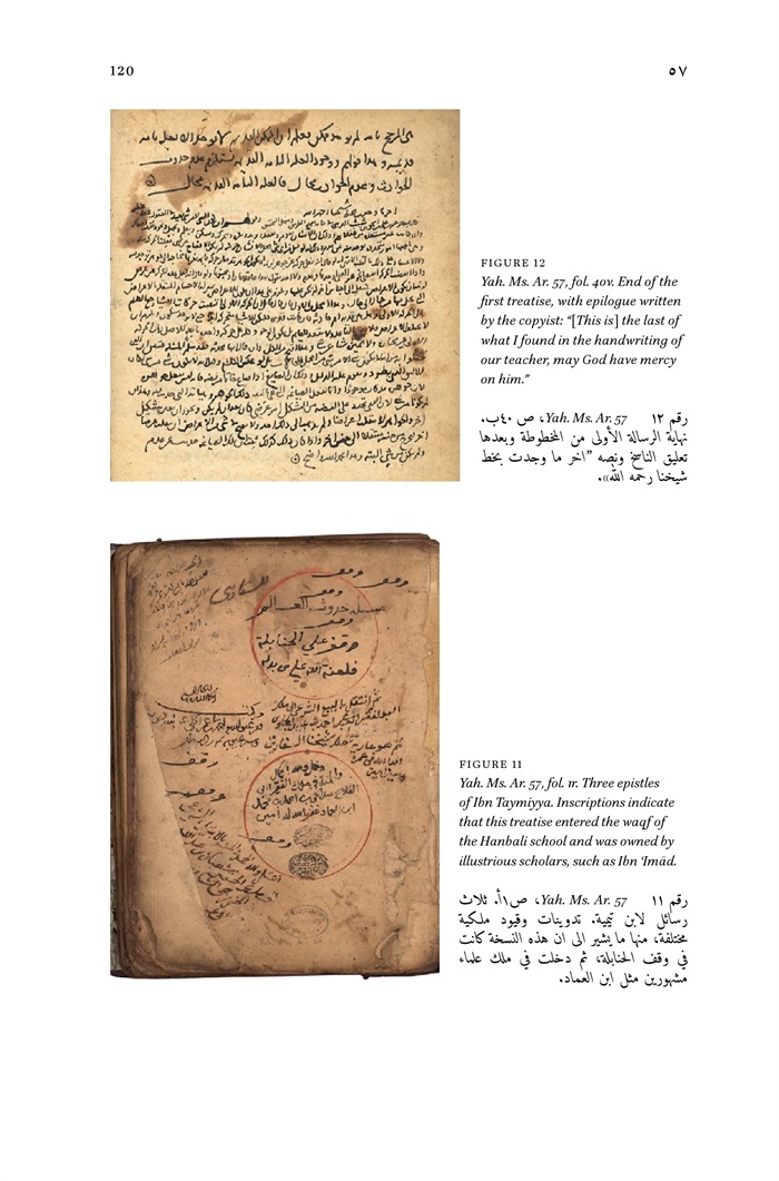 11 - Yah. Ms. Ar. 57, fol. ir. Three epistles of Ibn Taymiyya. Inscriptions indicate that this treatise entered the waqf of the Hanbali school and was owned by illustrious scholars, such as Ibn 'Imād