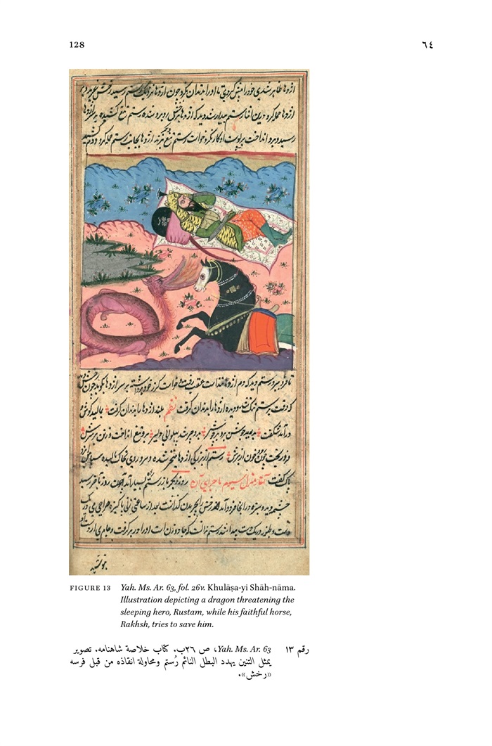 13 - Yah. Ms. Ar. 63, fol. 26v. Khulāṣa-yi Shāh-nāma. Illustration depicting a dragon threatening the sleeping hero, Rustam, while his faithful horse, Rakhsh, tries to save him 128