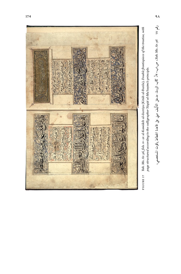 17 - Yah. Ms. Ar. 96, fols. 1V-2r. al-Kawakib al-durriya (Kitab al-Burda). Double frontispiece of the treatise, with page structured according to the calligrapher Yaqut al-Mu'taşimi's principle 174
