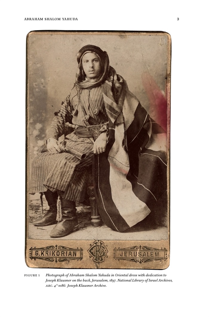 1 - Photograph of Abraham Shalom Yahuda in Oriental dress with dedication to Joseph Klausner on the back, Jerusalem, 1897. National Library of Israel Archives, ARC. 4° 1086: Joseph Klausner Archive 3