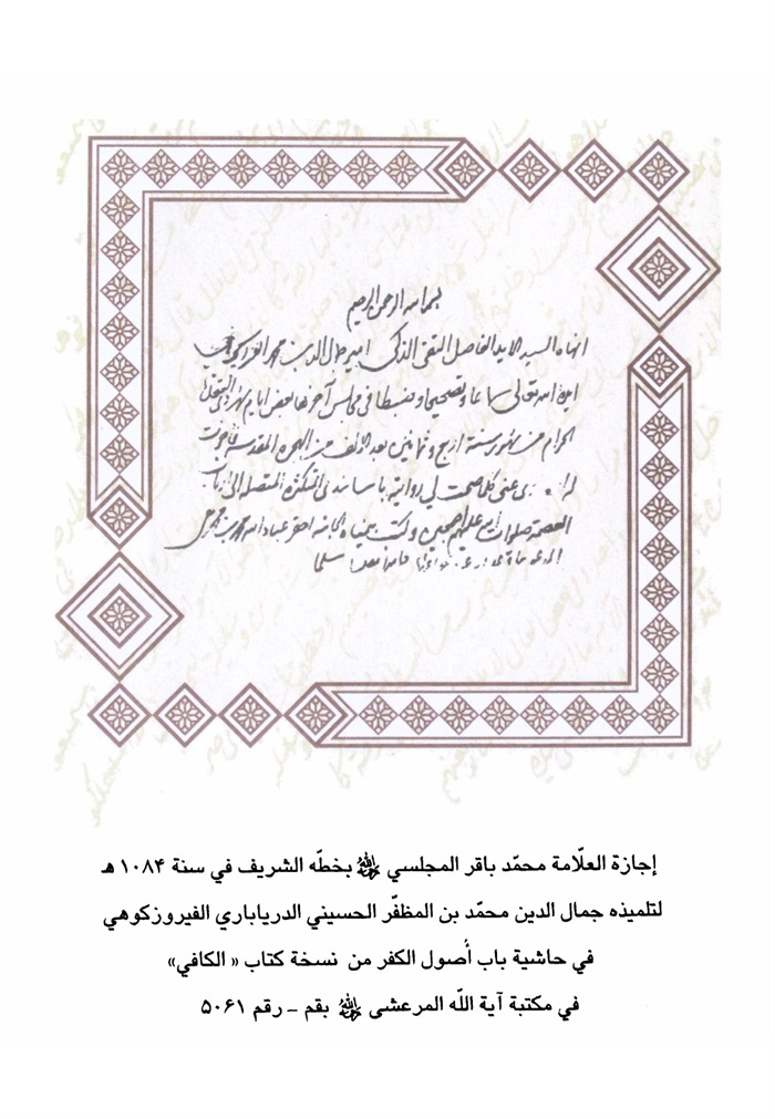 إجازة العلّامة محمّد باقر المجلسي رحمه الله بخطّه الشریف في سني 1084ه