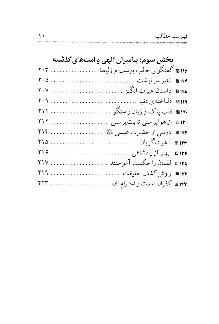 اختصاص دارد. بخش دوم با عنوان معاصرین چهارده معصوم (علیه السلام ) (نکته ها و گفته ها) می باشد. پیامبران (علیهم السلام ) و امتهای گذشته نیز عنوان بخش سوم کتاب را تشکیل میدهد. لازم به ذکر است، در ترجمه این داستانها گاه با حفظ امانت، از ترجمه تحت اللفظی گامی فراتر نهاده ایم تا به جذابیت و همین طور انتقال معنای حقیقی عبارات افزوده باشیم، در این مسیر بعضا از پاره ای ترجمه های موجود نیز بهره گرفته ایم. به طور قطع، اینجانب از کاستی های احتمالی در ترجمه و ارائه مجموعه حاضر مطلع بوده و ادعایی ندارد، ولی امید است اهل نظر با پیشنهادات ارزنده خود، ما را هر چه بیشتر در تکمیل این جلد و مجلدات بعدی یاری نمایند.