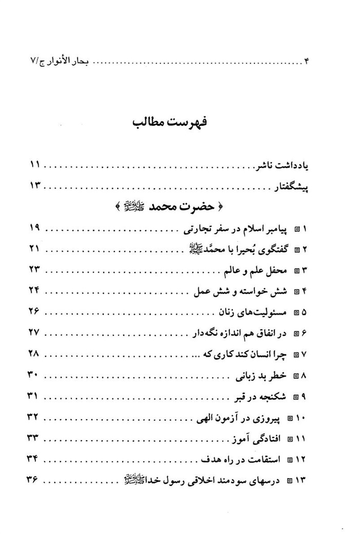 گسترده فقهی، تفسیری، کلامی، تاریخی و اخلاقی بهره گرفته شده است. کتاب بحارالانوار تا کنون بارها به زیور طبع آراسته گردیده، اما مأخذ ما در این مجموعه، بحار چاپ تهران بوده که اخیرا در صد و ده جلد به چاپ رسیده است. در ضمن، این کتاب شریف اکنون به شکل برنامه کامپیوتری نیز موجود است و علاقه مندان برای سهولت دسترسی به روایات مورد نظر می توانند از این امکان جدید بهره مند گردند. نگارنده، طی سالیان دراز در پی بهره گیری از داستانها و مطالب مفید این کتاب نورانی و انتقال آن به هموطنان و برادران دینی بوده است. از آنجا که به هر حال، متن کتاب به عربی نگاشته شده است و غالب عزیزان نمی توانستند از مطالعه جامع تر مطالب آن - حداقل در یک مجموعه مشخص - بهره مند گردند، لذا اقدام به ترجمه داستانها و قطعه های ارزشمندی از این دایرة المعارف عظیم، تحت عنوان داستانهای بحارالانوار نمودم. اکنون بر آنیم جلد هفتم از داستانهای بحارالانوار را تقدیم طالبان تشنه معارف الهی و بخصوص اخلاق و زندگانی بزرگان عالم تشیع نماییم .