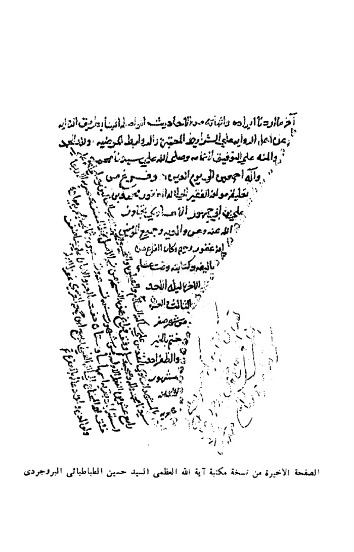و الحمد للّه أولا و آخرا و صل اللّه على محمّد و آله الطاهرين. و ذلك في صبيحة اليوم الذي بارك اللّه سبحانه و تعالى لهذه الأمة بمولد سيد الأنبياء، و أشرف المرسلين محمّد صلّى اللّه عليه و على آله الطيبين الطاهرين و رزقنا اللّه تعالى شفاعتهم يوم الدين. من السنة الثالثة بعد الاربعمائة و الالف للهجرة النبويّة بقم المقدّسة. و أنا الاقل مجتبى المحمدي العراقي.