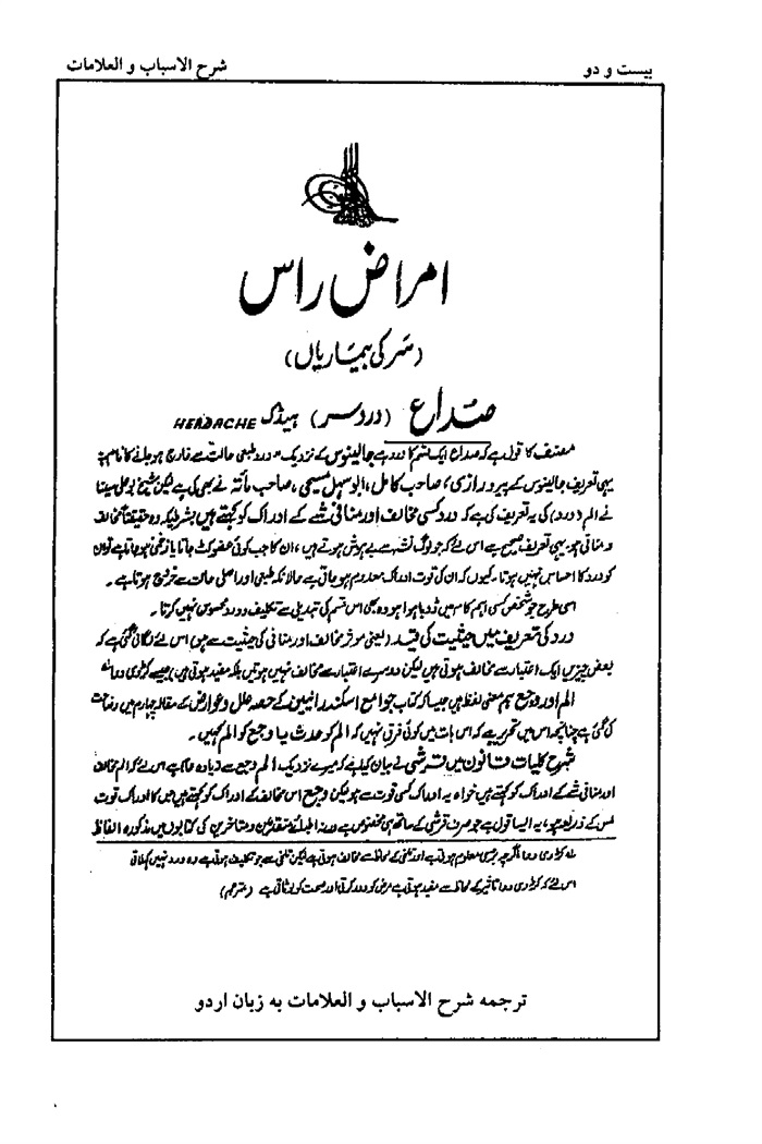 6- گاهى از نسخه ترجمه شرح الاسباب و العلامات به زبان اردو استفاده شد اين ترجمه توسط حكيم خواجه رضوان احمد انجام شده و در كراچى به چاپ رسيده است.