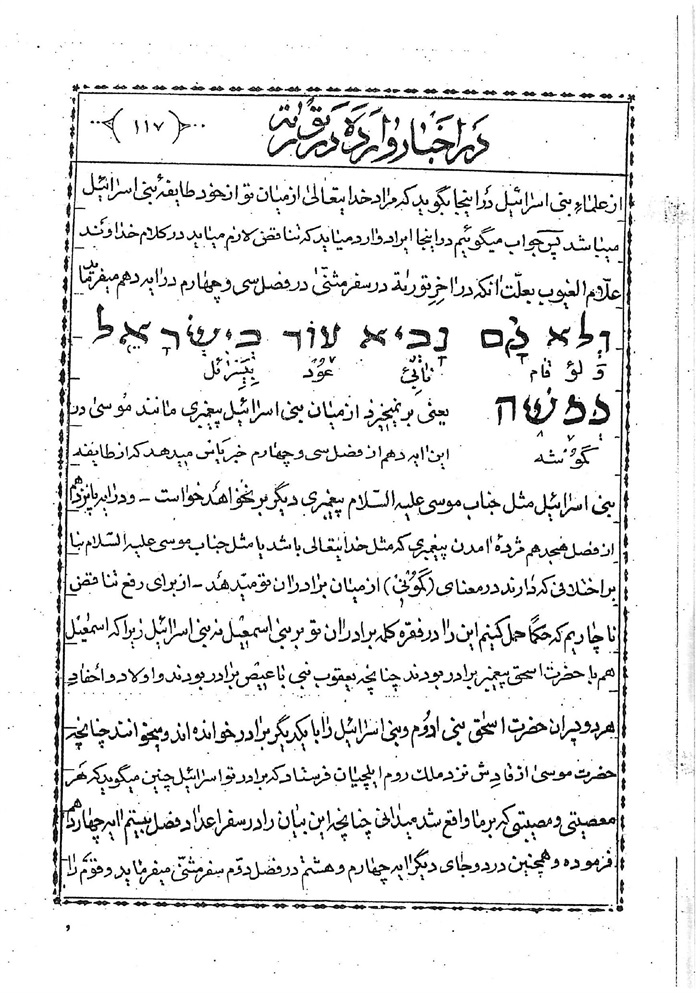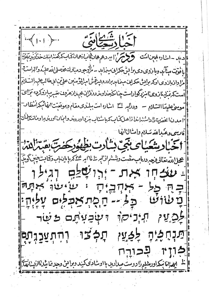 و بر كرّة بچّه الاغ سوار است . 11 و من عرّابه را از افرایم و اسب را از اورشلیم منقطع خواهم ساخت و کمان جنگی شکسته خواهد شد و او با امّت ها بسلامتی تکلّم خواهد نمود و سلطنت او از دریا تا دریا و از نهر تا اقصای زمین خواهد بود و مرحوم نراقی در كتاب سيف الامه ترجمه این دو ایه را چنین بیان کرده - یعنی شاد باش ای ولایت اسلام و خوشحالی کن ای ولایت بیت المقدس که اینک می آید پادشاه تو از برای تو راست گو و شفاعت کننده گناهکاران فقیر باشد و سوار شود بر الاغ و نیست کند اسب سواری را از میان یهود و لشکر را از بیت المقدس و بشكند كمان جنگ را و ظاهر کند اسلام را در میان عجمان و برسد حكم او از دریا ها و بدریا ها و رودخانه ها تا انتهای زمین - و معنی این فقرات بنوع مذکور بنحویست که موافق با معانی الفاظ ان ها است و یکی از علماء نصاری و دیگری از يهود ان ها را تفسیر کرده اند بان چه في الجمله مخالفتی با ان چه ما تفسیر کردیم دارد و ان دو تفسیر با هم اندك تغایری دارند و لیکن هیچ یک مضرّ باستدلال ما نیستند امّا مفسّر نصرانی چنین تفسیر کرده که یعنی خرّم باش ای دختر اسلام و خوشحالی کن ای دختر بیت المقدّس هان که پادشاه تو بیاید بتو که معصوم و شفاعت کننده باشد و فقیر خواهد بود و الاغ سوار شود و نیست کند لشکر را از افراهیم یعنی از سبط یهود و بر طرف کند اسب را و خواهد شکست کمان جنگ را و خبر زمان عدالت را بعجمان بدهد و اختیار او از دریا و از همه رود خانه ها تا انتهای زمین خواهد بود - و امّا مفسّر یهودی چنین تفسیر کرده که شاد باش اي طایفه و جماعت بيت المقدّس و خوشحالی کن ان جماعت اسلامیان که پادشاه تو می اید و راست گو و فرح دهنده باشد تا آخر مگر این که بجای خبر زمان عدالت بعجمان بدهد گفته و بیان کند اسلام را از برای همه گروه ها و بنا بر سه تفسیر صراحت ان ها در مطلب واضح است و انطباق او بر پیغمبر ما