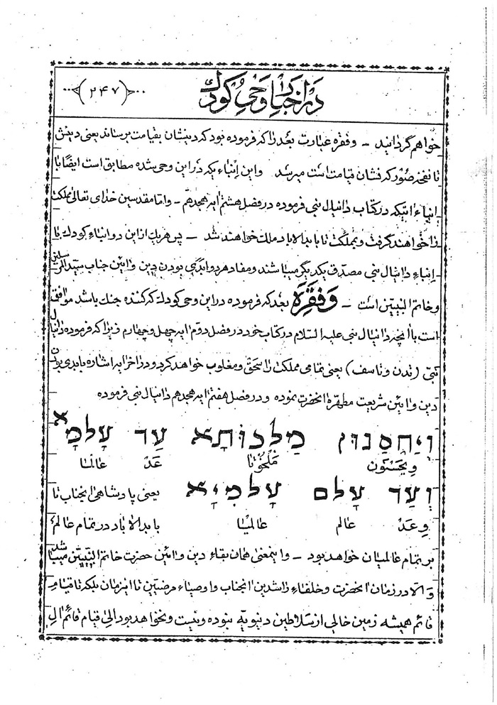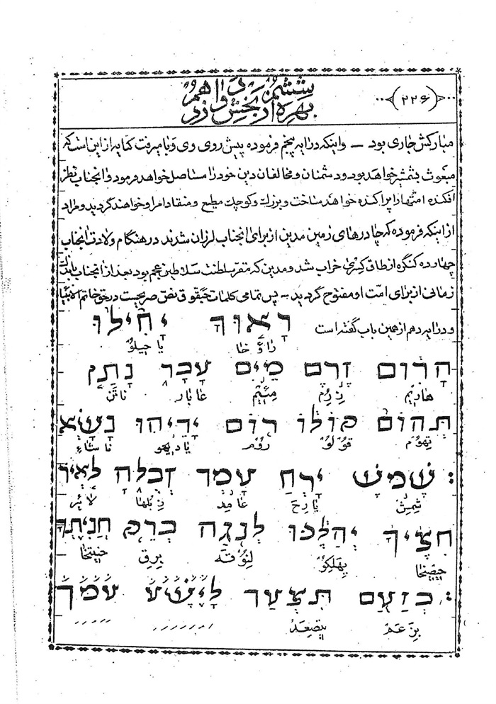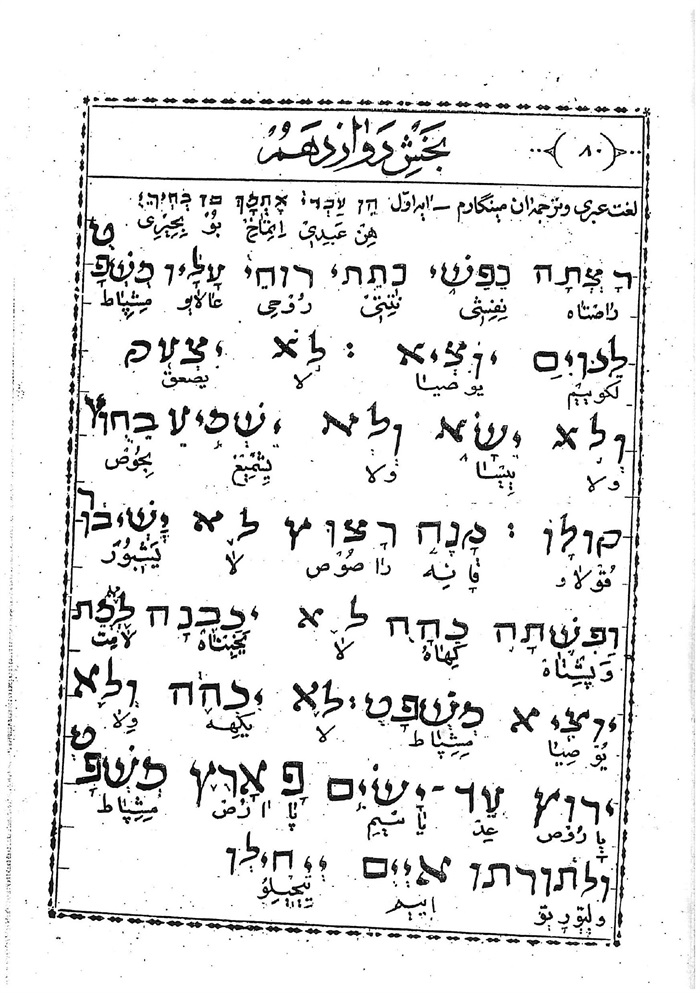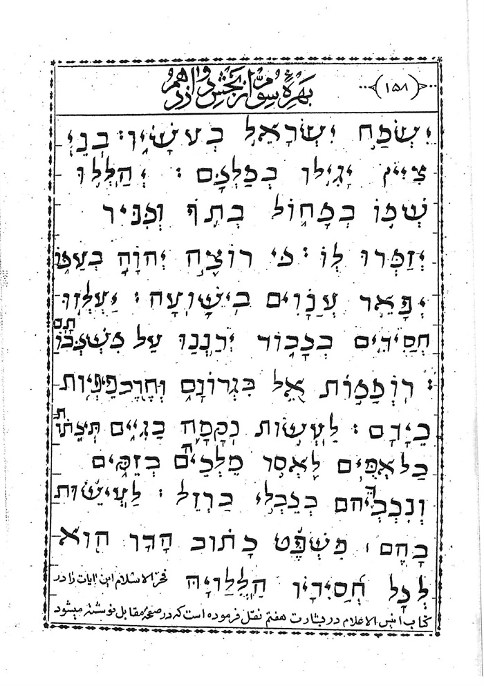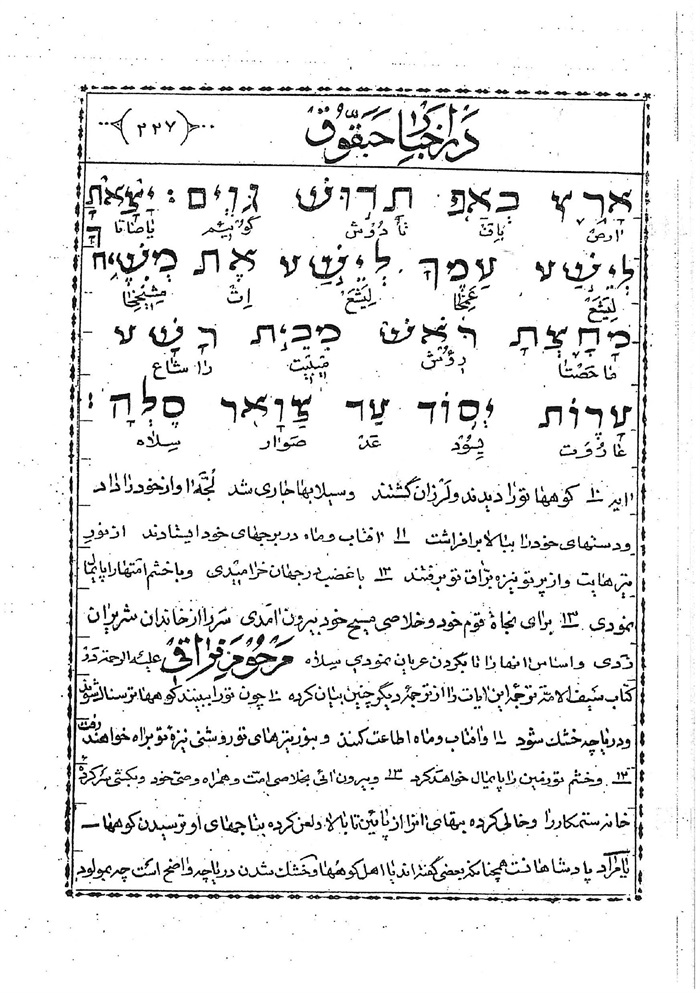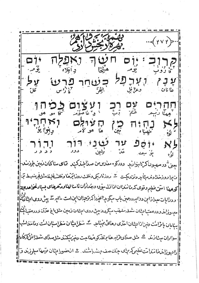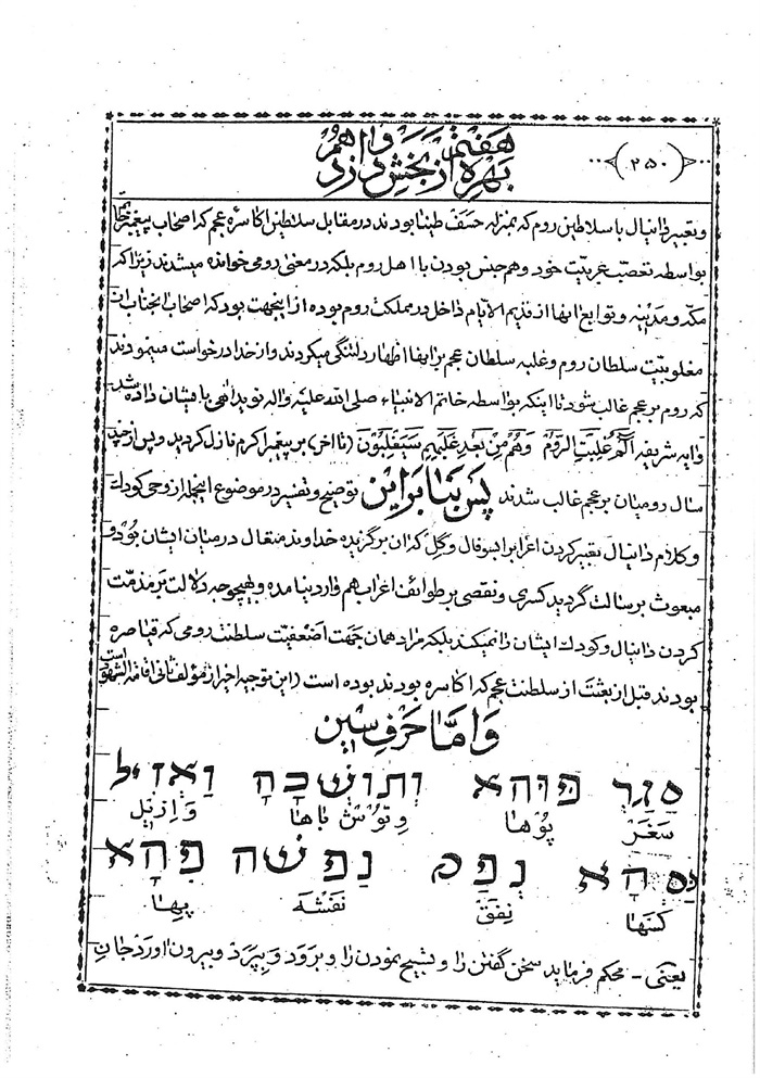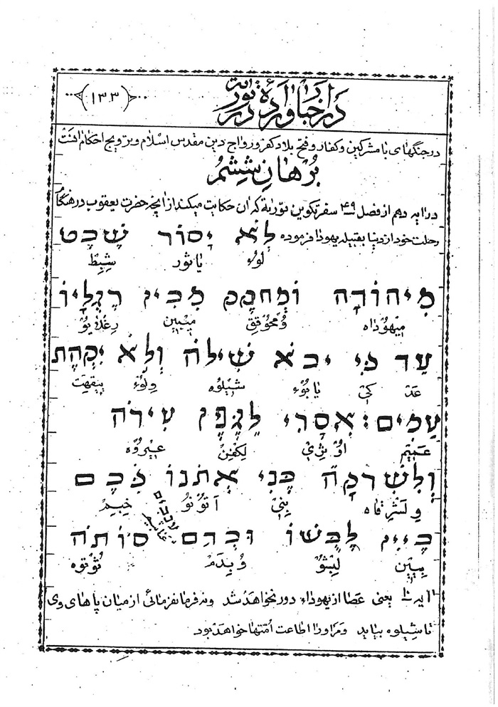 دِشقیلَلي ذِرِعَیلى بِخَقلَي وَ هَى بُوش ذِعُورَ تَلَ مِن كُلَّهُ بَرْ ذَرعِي اینَ ایُمَن دُكُور وِسَلَ بُوش كُورتِلَ مِنْ كُلَّهُ يَرقيَ كِهِ هُوَى ایلَنَ اَخ دِاَتي طَیرِی دِشمَیَ شَرِى بِپَعوَن - ترجمه 31 بار دیگر مثلی برای ایشان زده گفت ملکوت اسمان مثل دانه خردلی است که شخصی گرفته در مزرعه خویش کاشت 32 و هر چند از سایر دانه ها کوچک تر است ولی چون نموّ کند بزرگ ترین بقول است و درختی می شود چنان که مرغان هوا آمد در شاخ هایش اشیانه می گیرند مراد اینست که ملکوت اسمان راه نجاتی است که بسبب ظهور شرع محمّد صلی الله عليه و اله ظاهر شود چنان چه ان حضرت در میان قومی نشود نما کرد که در نزد اهل عالم حقیر و پست بودند زیرا که غالبًا بادیه نشین بودند و از علوم و صنایع بی بهره و محروم بودند و هم چنین از لذّت های جسمانی و بخصوص جماعت یهود بنظر حقارت و پستی بایشان می نگریستند زیرا که از اوّلاد هاجر بودند پس خدای تعالی از میان ایشان برانگیخت حضرت خاتم الانبياء صلى الله عليه و اله را و شریعت ان جناب در اوّل امر بمنزله خردلی بود بر حسب ظاهر کوچک تر از همه شریعت ها لكن نسبت بهمه اهل زمین عمومیّت داشت و در مدّت کمی نموّ و رشد عجیب کرد و برزگ ترین شریعت ها شد و شرق و غرب را احاطه کرد باندازه ای که کسانی که پیروی از هیچ شریعتی نمی کردند بشریعت ان جناب پیرو شدند و زیر سایه شریعت ان حضرت جا گرفتند
