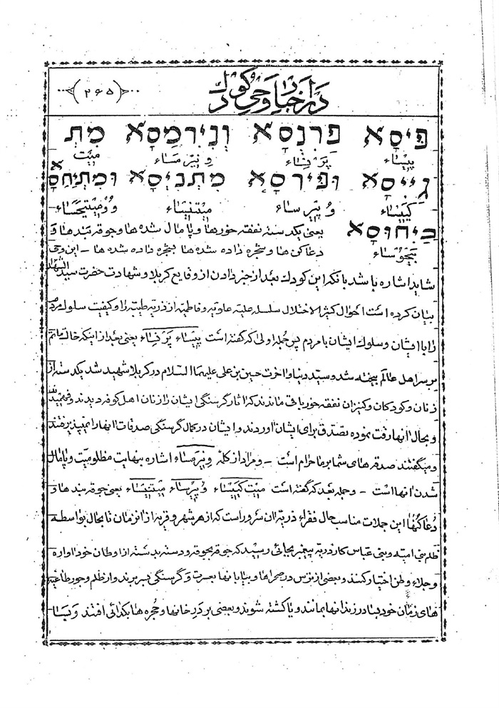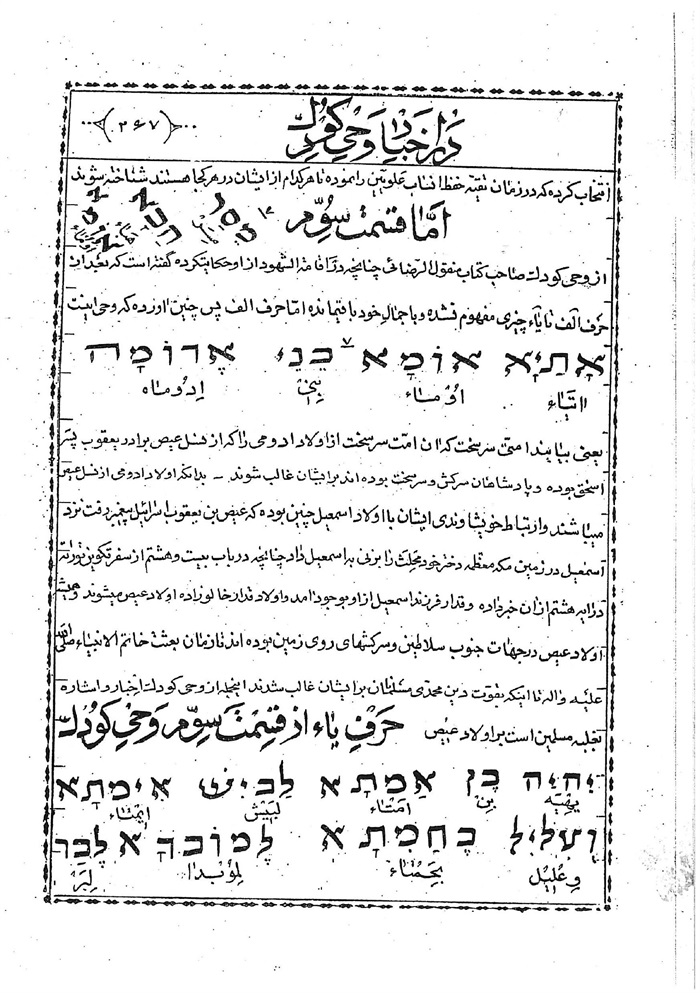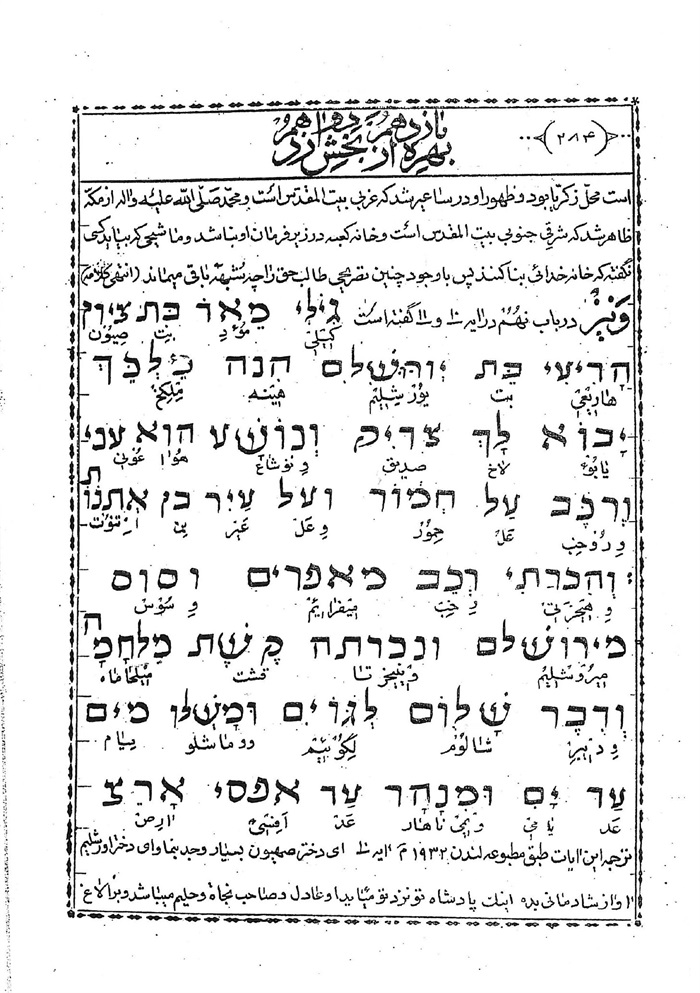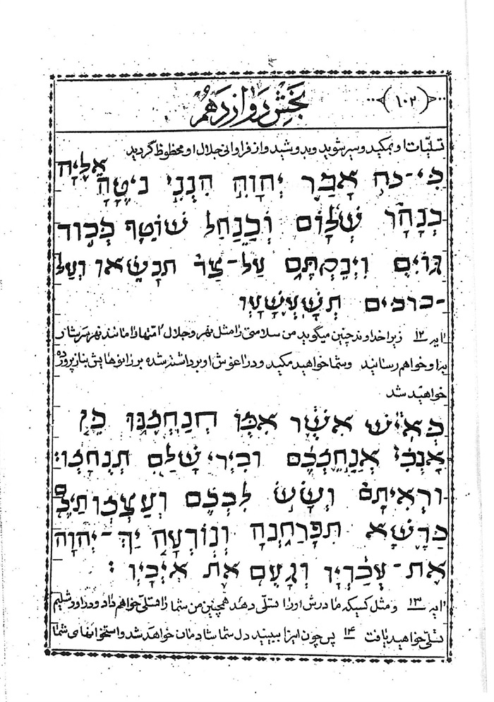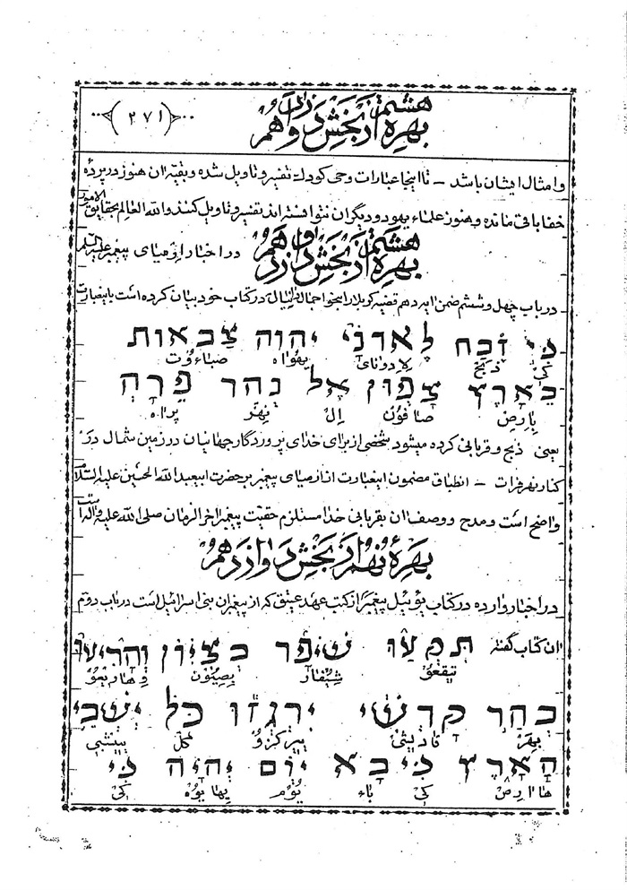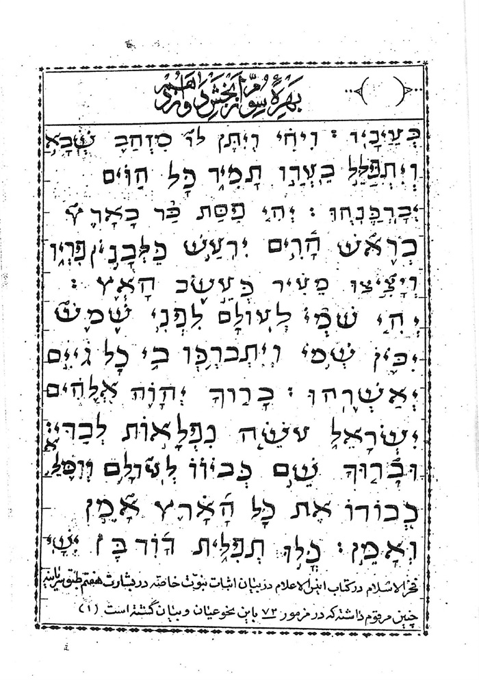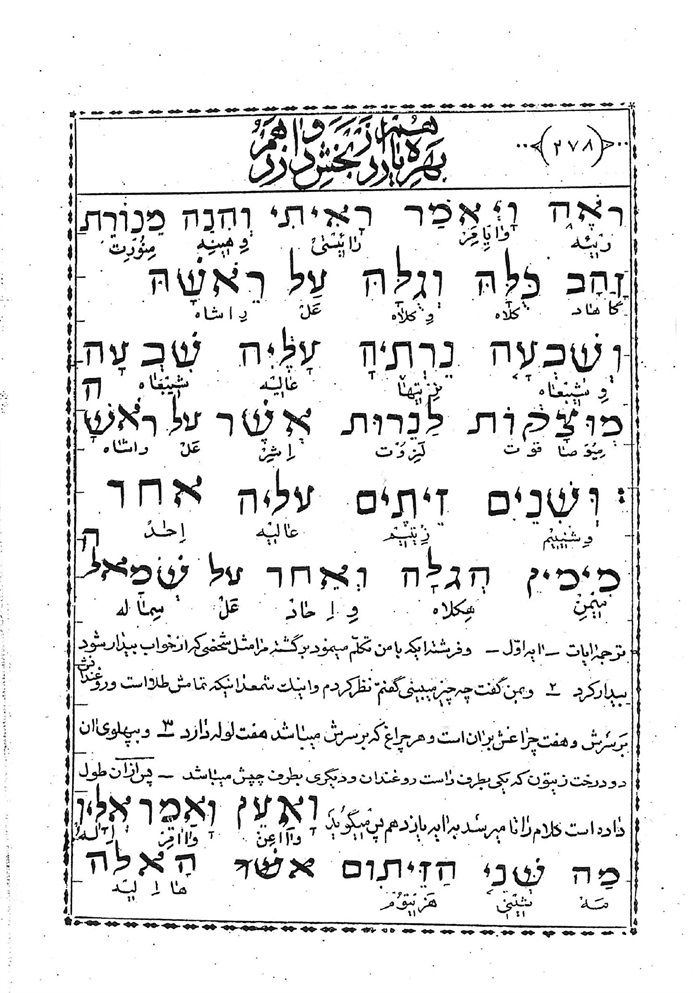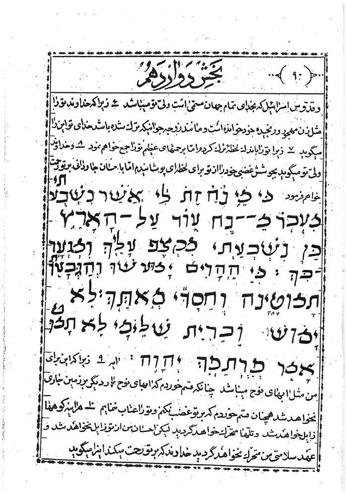 دِشقیلَلي ذِرِعَیلى بِخَقلَي وَ هَى بُوش ذِعُورَ تَلَ مِن كُلَّهُ بَرْ ذَرعِي اینَ ایُمَن دُكُور وِسَلَ بُوش كُورتِلَ مِنْ كُلَّهُ يَرقيَ كِهِ هُوَى ایلَنَ اَخ دِاَتي طَیرِی دِشمَیَ شَرِى بِپَعوَن - ترجمه 31 بار دیگر مثلی برای ایشان زده گفت ملکوت اسمان مثل دانه خردلی است که شخصی گرفته در مزرعه خویش کاشت 32 و هر چند از سایر دانه ها کوچک تر است ولی چون نموّ کند بزرگ ترین بقول است و درختی می شود چنان که مرغان هوا آمد در شاخ هایش اشیانه می گیرند مراد اینست که ملکوت اسمان راه نجاتی است که بسبب ظهور شرع محمّد صلی الله عليه و اله ظاهر شود چنان چه ان حضرت در میان قومی نشود نما کرد که در نزد اهل عالم حقیر و پست بودند زیرا که غالبًا بادیه نشین بودند و از علوم و صنایع بی بهره و محروم بودند و هم چنین از لذّت های جسمانی و بخصوص جماعت یهود بنظر حقارت و پستی بایشان می نگریستند زیرا که از اوّلاد هاجر بودند پس خدای تعالی از میان ایشان برانگیخت حضرت خاتم الانبياء صلى الله عليه و اله را و شریعت ان جناب در اوّل امر بمنزله خردلی بود بر حسب ظاهر کوچک تر از همه شریعت ها لكن نسبت بهمه اهل زمین عمومیّت داشت و در مدّت کمی نموّ و رشد عجیب کرد و برزگ ترین شریعت ها شد و شرق و غرب را احاطه کرد باندازه ای که کسانی که پیروی از هیچ شریعتی نمی کردند بشریعت ان جناب پیرو شدند و زیر سایه شریعت ان حضرت جا گرفتند