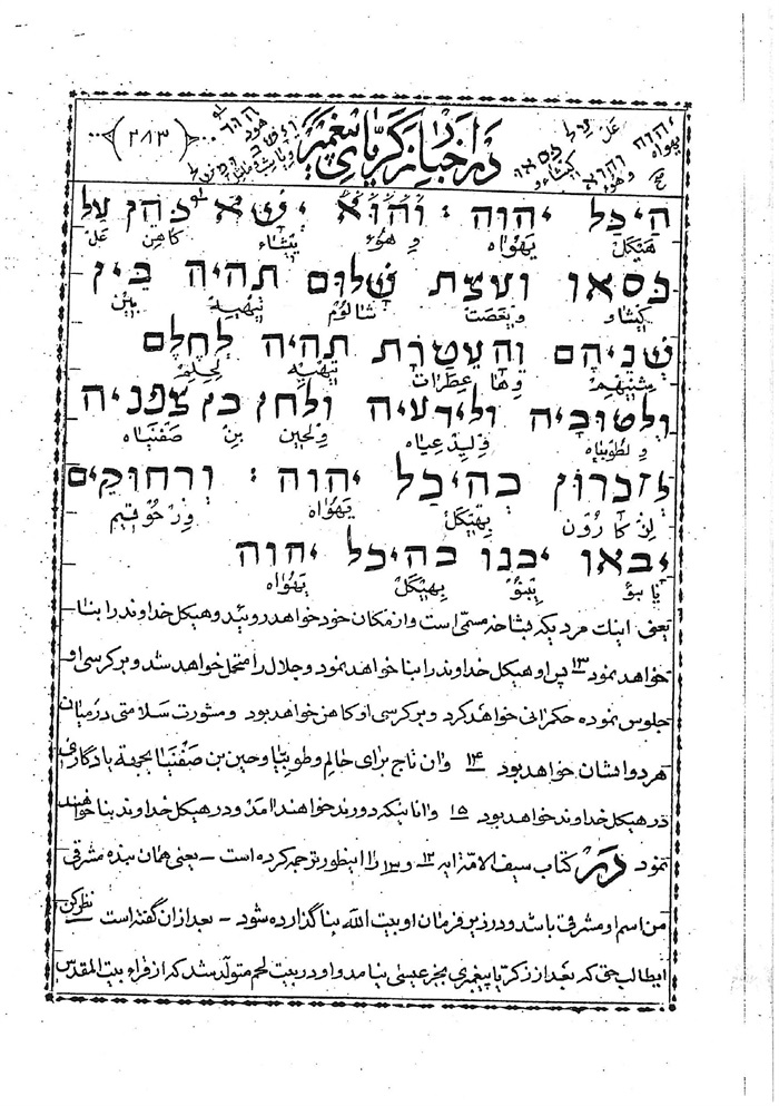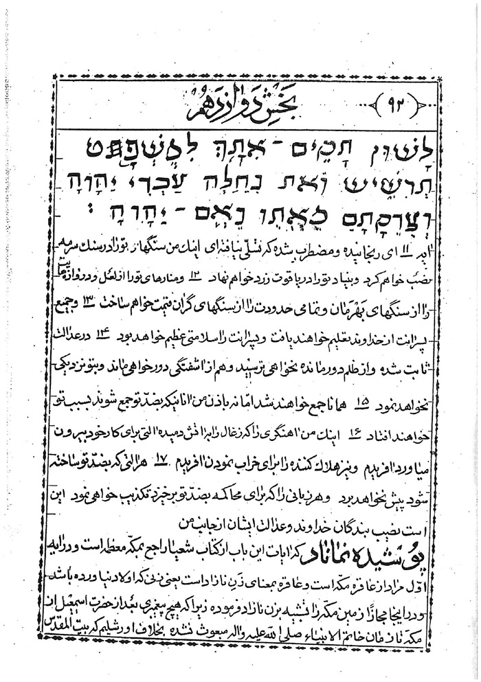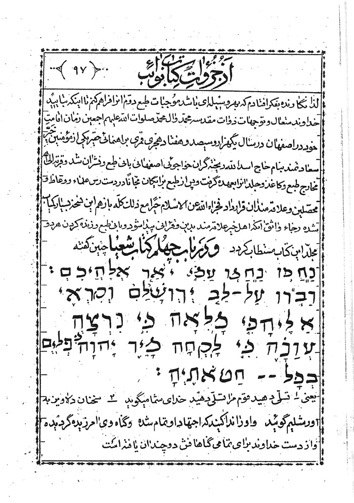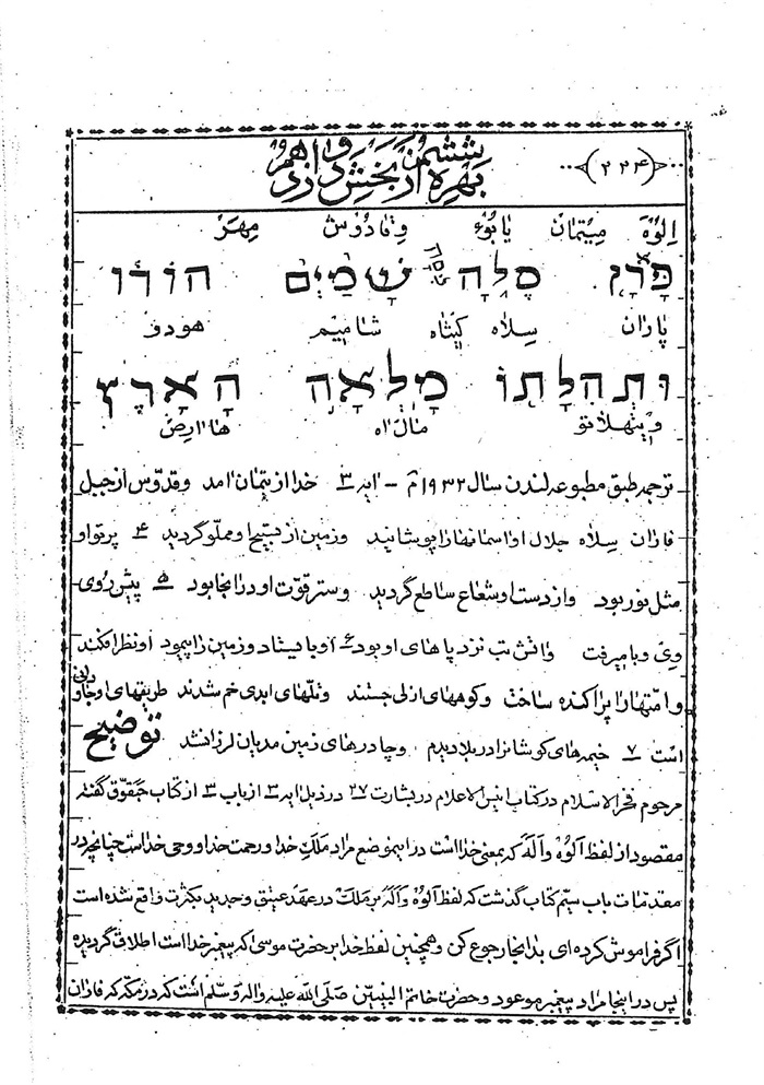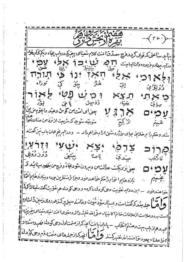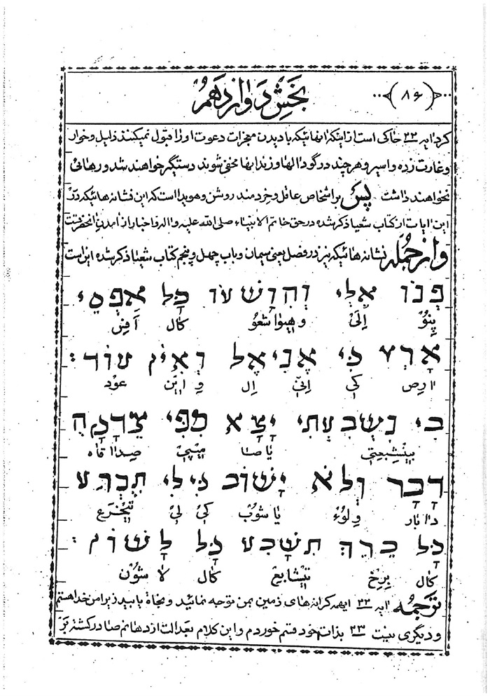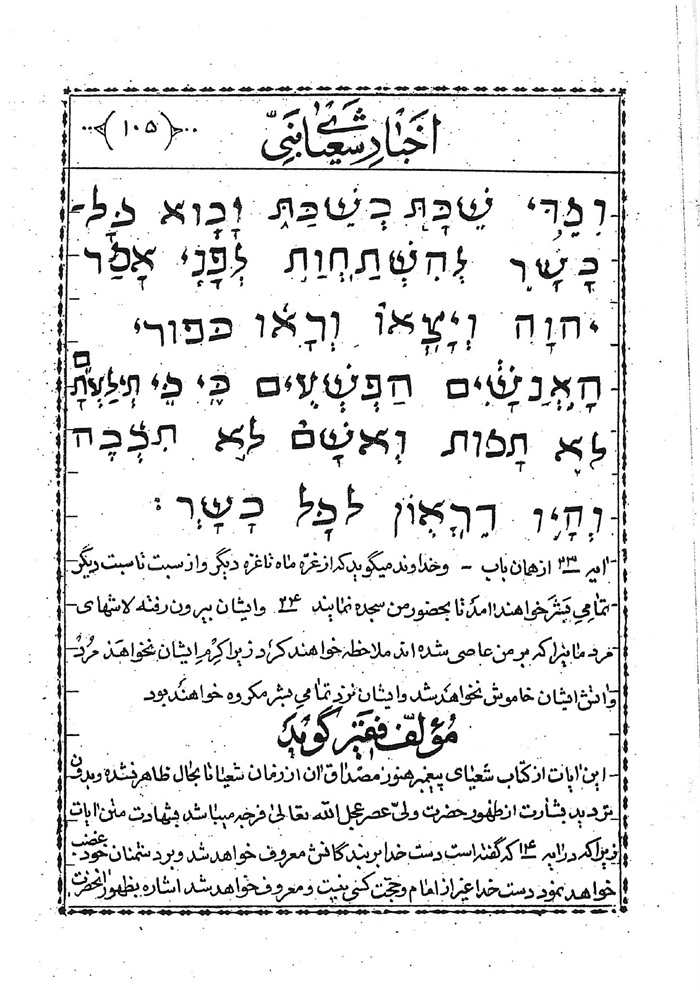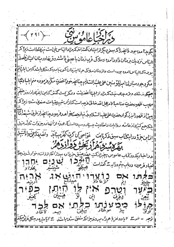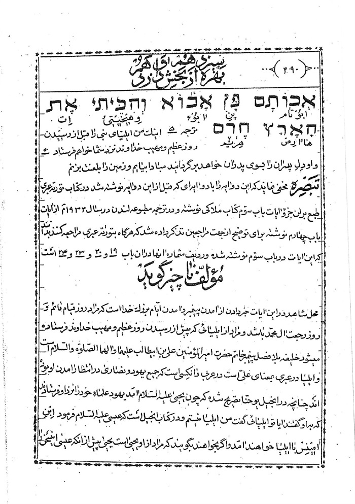 ترجمه طبق همان مطبوعه ایه 19 اینک در ان زمان بر همه آنانی که بر تو ظلم می کردند مکافات خواهم رسانید و لنگان را خواهم رهانید و رانده شدگان را جمع خواهم کرد و انانی را که عار ایشان در تمامی زمین می بود محل تسبیح و اسم خواهم گردانید 20 در ان زمان شما را در خواهم آورد و در ان زمان شما را جمع خواهم کرد زیرا خداوند می گوید حینی که اسیران شما را بنظر شما باز اوردم ان گاه شما را در میان تمامی قوم های زمین محلّ اسم و تسبیح خواهم گردانید مراد از این که در باب اوّل گفته روز عظیم خداوند نزدیکست تا ظهور حضرت خاتم الانبیاء صلى الله علیه و اله است یا روز ظهور حضرت صاحب الامر عجل الله تعالى فرجه و از قرائن سخنان بعد بیشتر دلالت بر زمان ظهور حضرت بقیة الله و ظهور دولت حقّة ال محمّد عليهم السّلام است و انتقام کشیدن ان حضرت از ظالمین و ستم کاران و از این که در باب دوّم گفته است تمامی خدایان جهان را زایل خواهد ساخت و جمیع جزائر امّت ها هر کدام از جای خود او را عبادت کنند و این که در باب سوّم گفته است که امّت ها را جمع نمایم و ممالک را فراهم اوردم تا انجائی که گفته است که در ان زمان زبان پاك به امّت ها باز خواهم داد تا جمیع ایشان اسم یهوه را بخوانند و بیک دل او را عبادت نمایند و ان چه در اواخر باب سوّم گفته همه این ها بیشتر با زمان ظهور دولت ولیّ عصر عليه السّلام موافقت دارد چنان چه از بعضی از ایات قرانیّه و اخبار و احادیث متواتره متكاثرة و مستفيضه و صحیحه و معتبرة و موثقّه جميع فرق مسلمين بخصوص فرقه امامیّه اثنی عشریّه مستفاد و فهمیده می شود