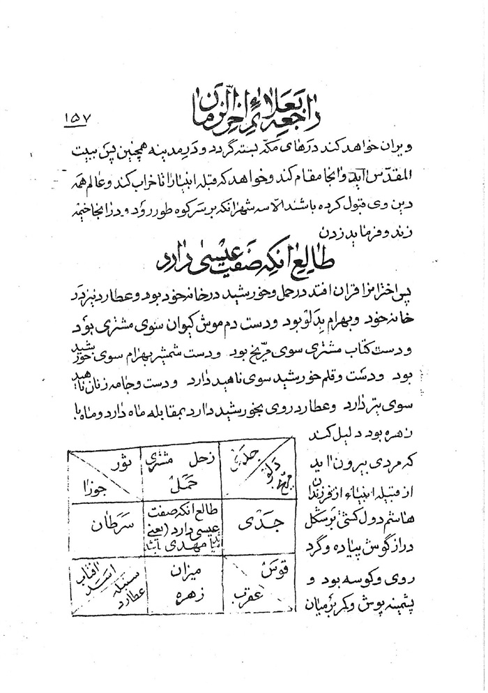 است محل زکریّا بود و ظهور او در ساعیر شد که غربی بيت المقدّس است و محمّد صلّى الله عليه و اله از مكّه ظاهر شد که شرقی جنوبی بیت المقدس است و خانه کعبه در زیر فرمان او نباشد و ما شیحی که بیاید کسی نگفته که خانه خدائی بنا کنند پس با وجود چنین تصریحی طالب حق را چه شبهه باقی می ماند (انتهی کلامه) و نیز در باب نهم در ایه 10 و 11 گفته است
