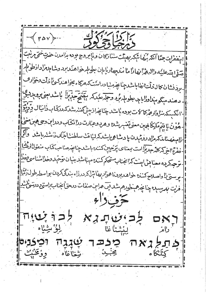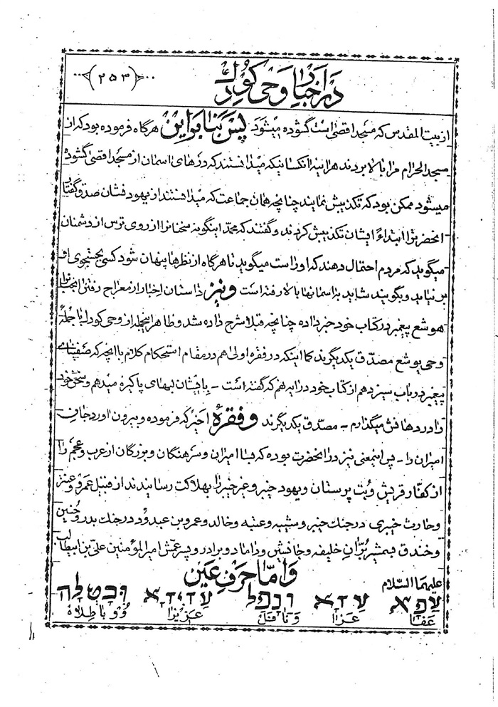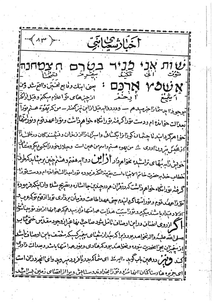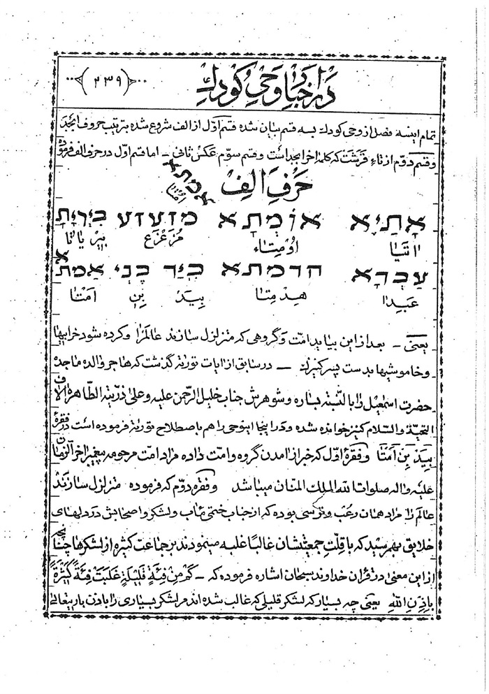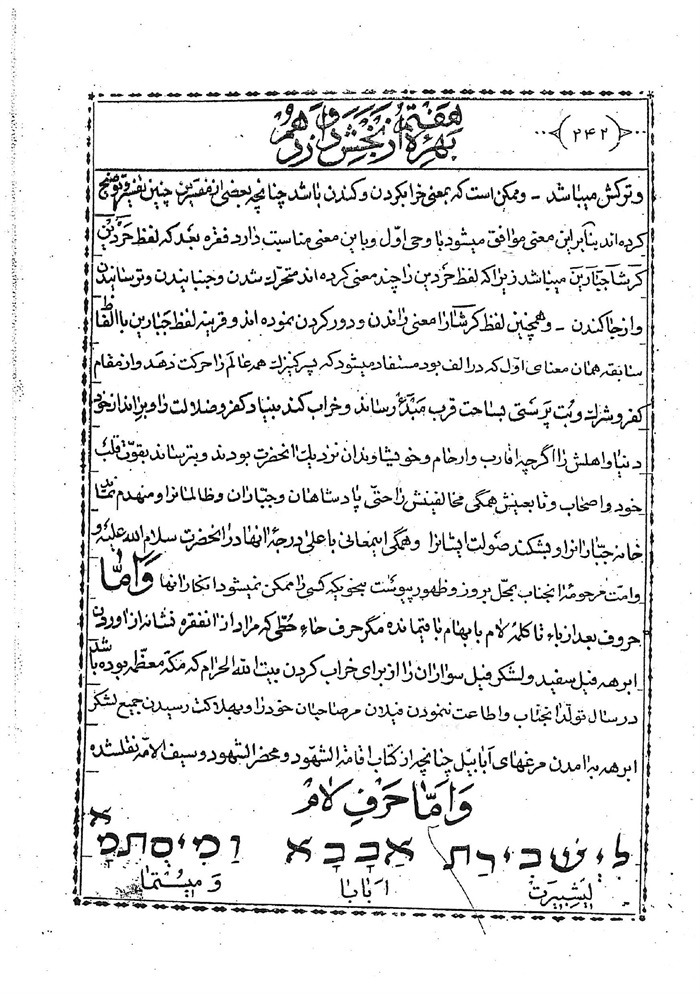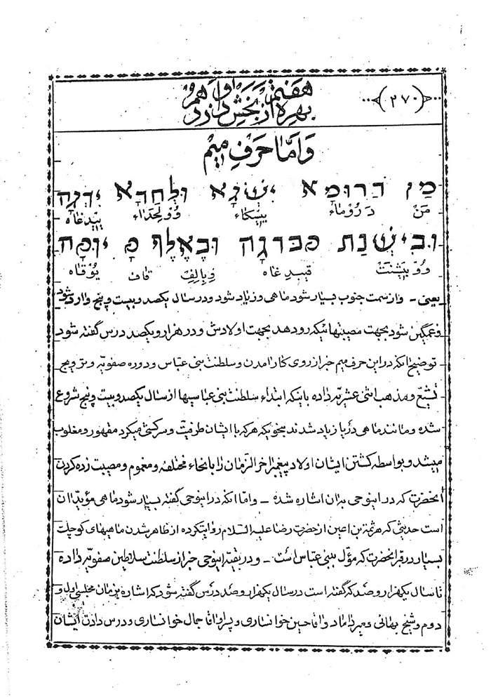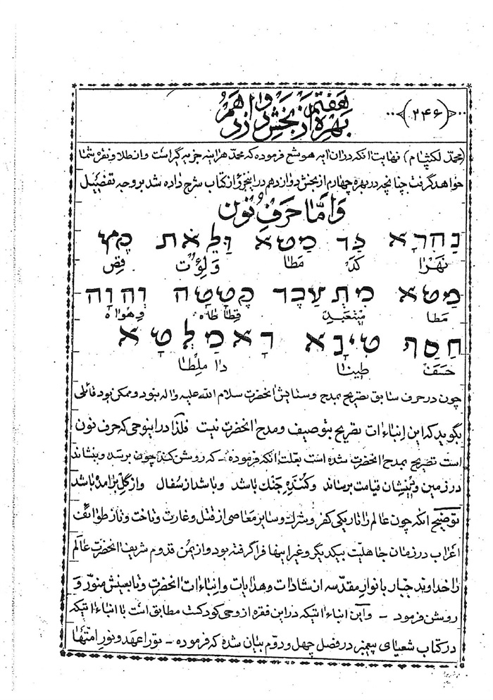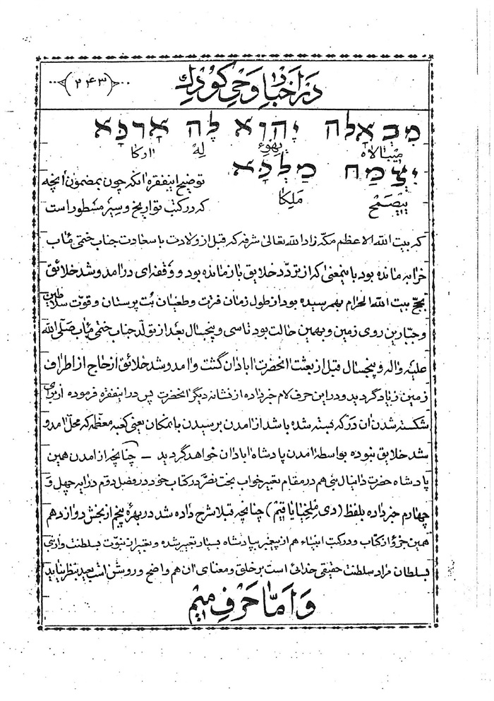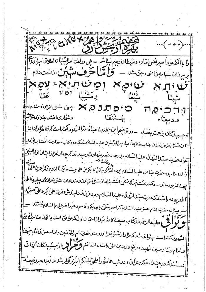 الحَمْدُ للهِ الحَيُّ القَيُّومُ ذِي اَلْعِزِّ وَ اَلْجَبَرُوتِ وَ القُدرَةِ وَ المَلَکُوت الّذى یُؤْتِي الْمُلْكَ مَنْ یَشَاءُ وَ ینْزِعُ الْمُلْكَ مِمَّنْ یَشَاءُ وَ یُعِزّ مَنْ یَشَاءُ وَ یُذِلّ مَنْ یَشَاءُ بِيَدِه الْخَيْرُ وَ هُوَ عَلَی كُلِّ شَيْءٍ قَدِيرٌ و أَفْضَلَ صَلَوَاتُهُ وَ أَكْمَلَ تَسليماتُهُ و تَحیّاتِه عَلَى أَفْضَلِ سُفَرائِهِ وَ أَكْمَلَ أَنْبِيَائِهِ وَ رُسُلِهِ أَوَّلِ بَحْرٍ تَشعب فیه الهُويّة وَ أَوَّلُ نَاراً وَ قَدَتْ مِنْ مِصْبَاحِ القِدَمیّة فِي مشكوة الواحِدّیَة فِى زُجاجَةٍ الاَحَديّة نَورَ اللَّهُ الاضوء الاَتَمَّ وَ اسْمِ اللَّهِ الاعْظَم الاعْظَم ابی الْقَاسِمِ مُحَمَّدٍ صَلَّى اللَّهُ عَلَيْهِ وَ الِهِ وَ سَلَّمَ سِيَّمَا عَلَى النَّفْسِ الّتی لِلْاِمكانِ مَصْدَر وَ لِلْمُمكن مِحْوَر وَ فِى الْكَوْنِ مُضمَر الْعَدْلِ الْمُؤَمِّلِ وَ الْحُجَّةُ الْمُنْتَظَرُ م ح م د بْنِ الْحَسَنِ الْعَسْكَرِيْ أَرْوَاحُنَا وَ أَرْوَاحَ الْعَالَمِينَ