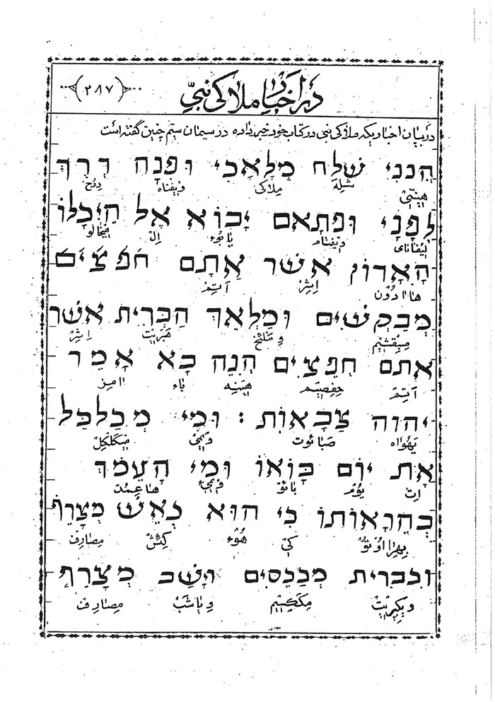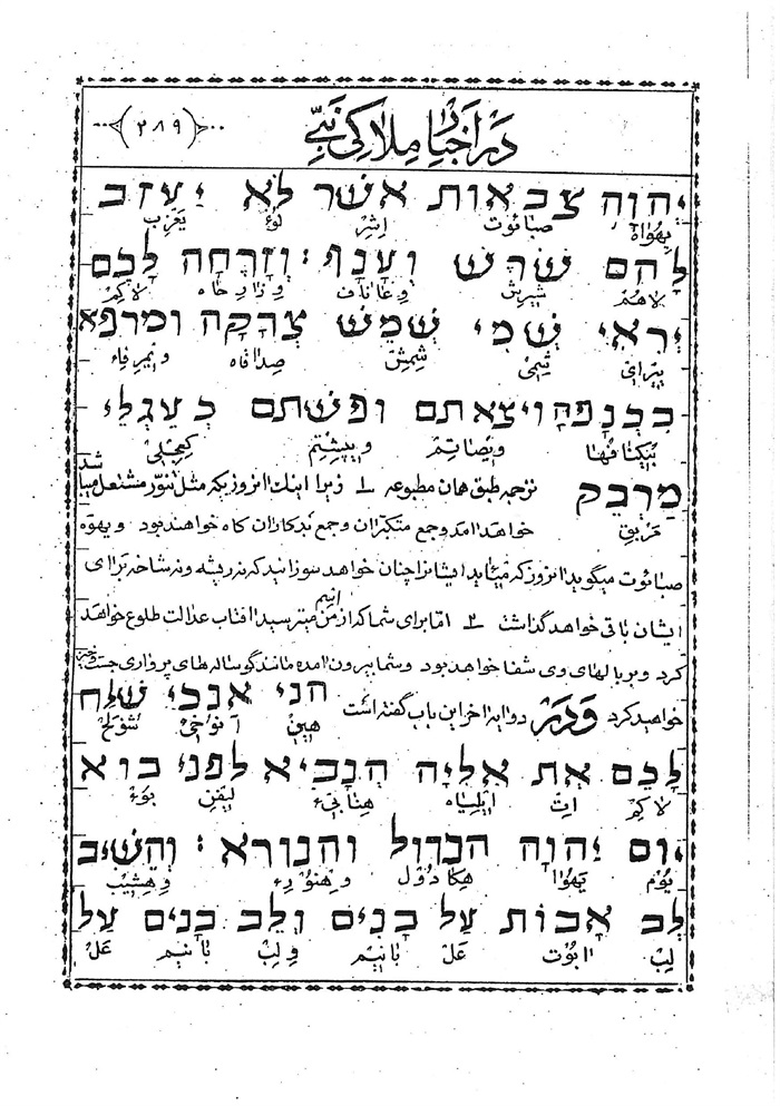 ترجمه طبق مطبوعه لندن 1932 آیه 1 اینك من رسول خود را خواهم فرستاد و او طریق را پیش روی من مهیّا خواهد ساخت و خداوندی که شما طالب او می باشید ناگهان به هیکل خونه خواهد امد یعنی ان رسول عهدی که شما از او مسرور می باشید همان او می اید قول يَهوه صبائوت این است 2 امّا کیست که روز امدن او را متحمّل شود و کیست که در حین ظهور وی تواند ایستاد زیرا که او مثل آتش قال گر و مانند صابون گازران خواهد بود 3 و مثل قال گر و مصفّی کننده نقره خواهد نشست و بنی لا وی را طاهر ساخته ایشان را مانند طلا و نقره مصفّی خواهد گردانید تا ایشان هدیه برای خداوند بعدالت بگذرانند 4 ان گاه هدیه یهود و اورشیلم پسندیده خداوند خواهد شد چنان که در ایّام قدیم و سال های پیشین می بود و نیز در باب چهارم از کتاب ملاکی گفته